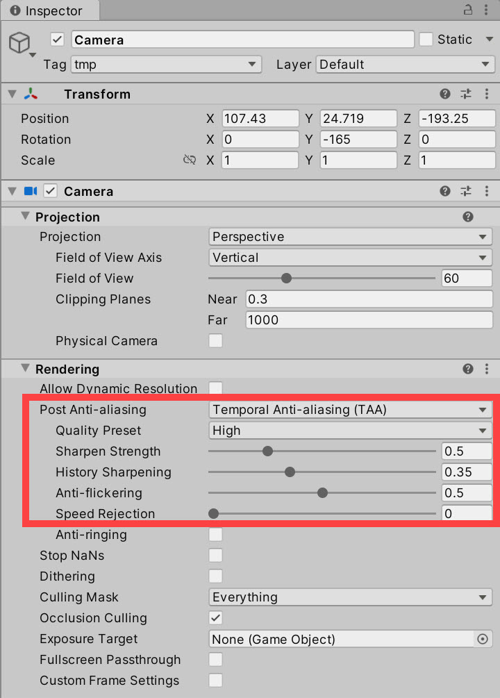 3)플리커링 문제를 최소화하려면 유니티에서 녹화 대상 카메라의 안티앨리어싱에서 TAA(Temporal Anti-Aliasing)를 선택하고 옵션을 설정합니다