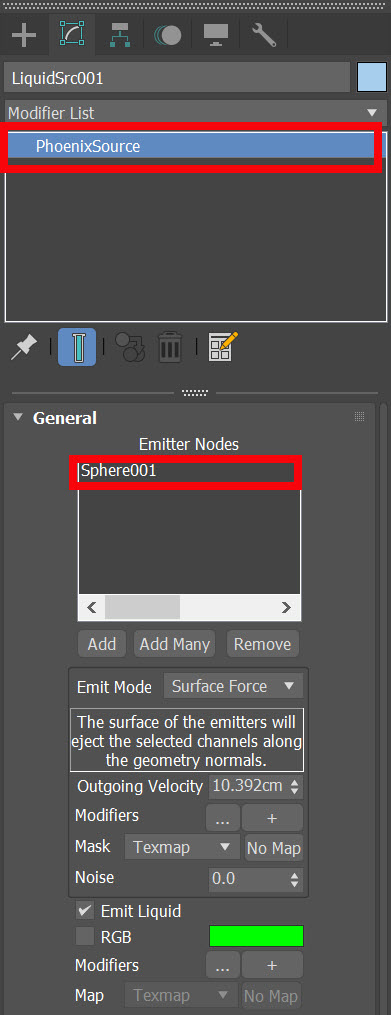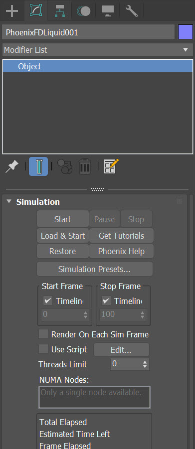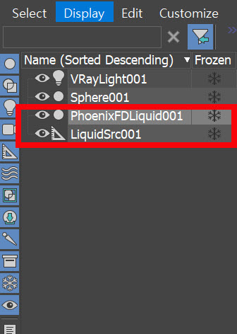 7)씬에 PhoenixFDLiquid001 오브젝트와 LiquidSrc001 오브젝트가 생성된것을 확인할수있습니다.