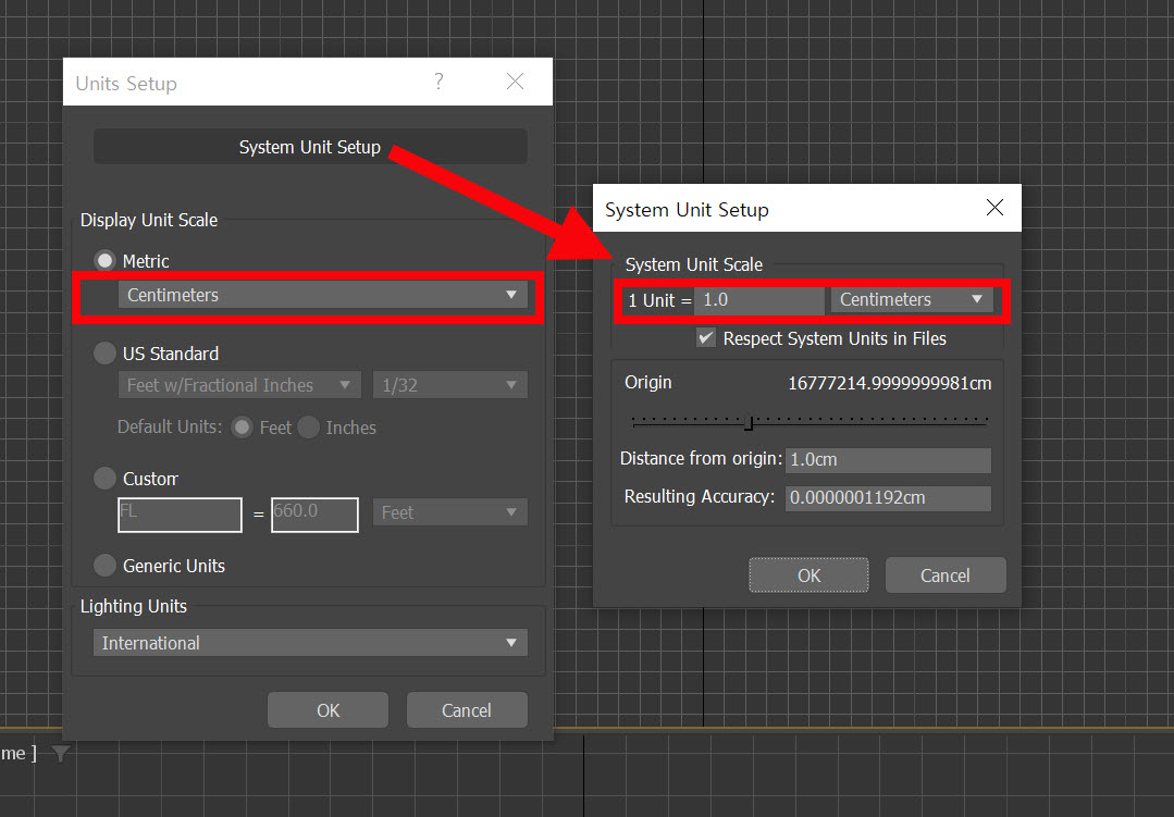 1)유닛 설정(System Units Setup)에서 유닛 스케일을 설정합니다(centimeters)