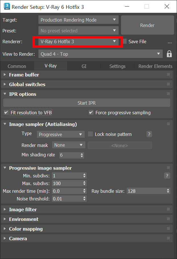 2)렌더러를 브이레이(V-Ray)로 설정합니다.