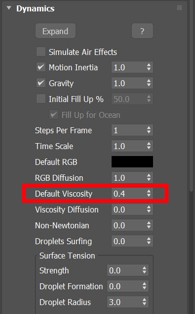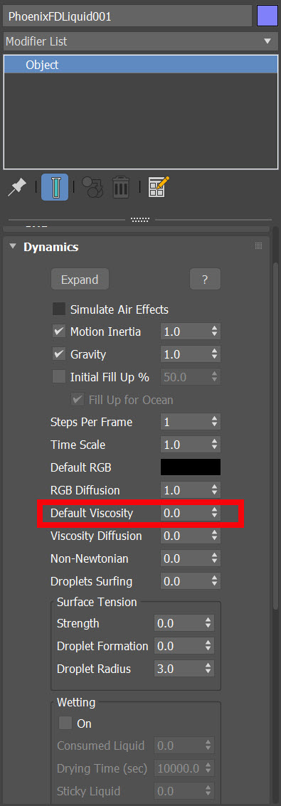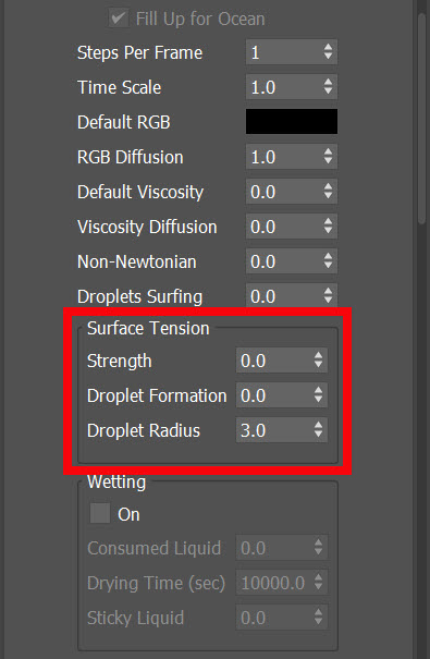 23)Object의 dynamics에서 surface tension(strength, droplet formation, droplet radius) 속성을 변경하여 액체의 표면장력을 설정합니다.
