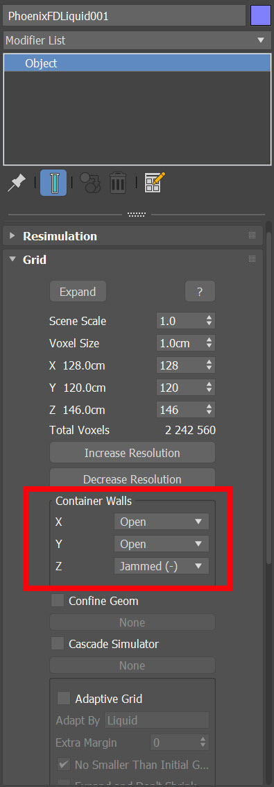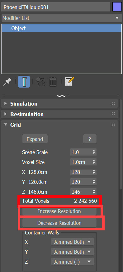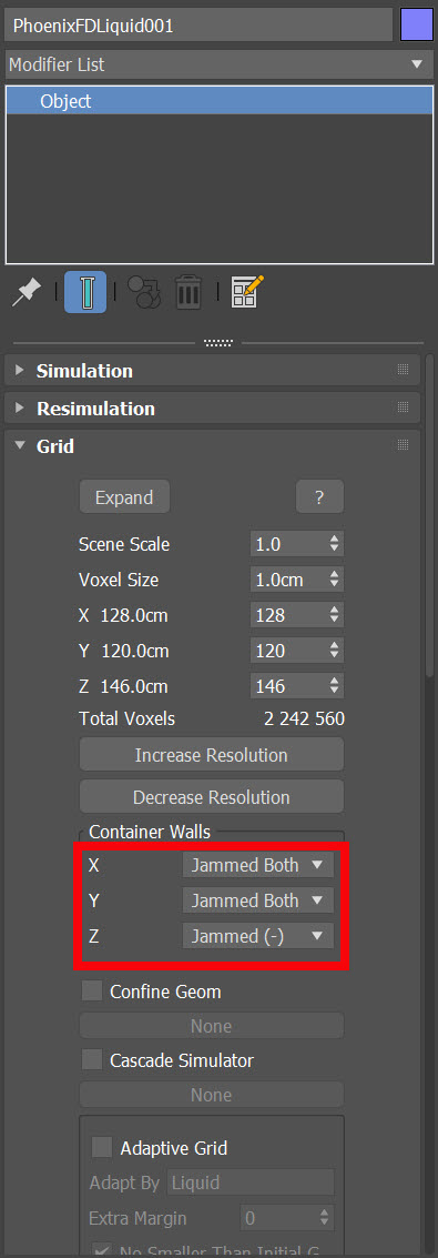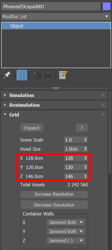 3)시뮬레이터(Object)의 grid에서 X, Y, Z 수치를 조절하여 시뮬레이션 영역 및 그리드의 크기를 재설정합니다.