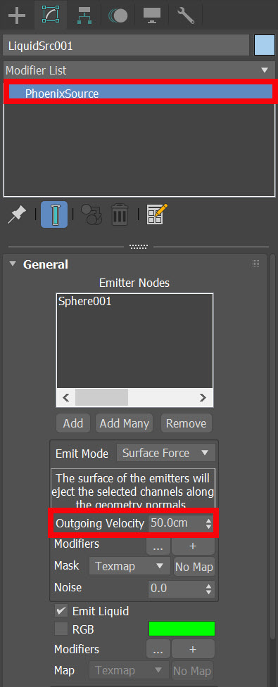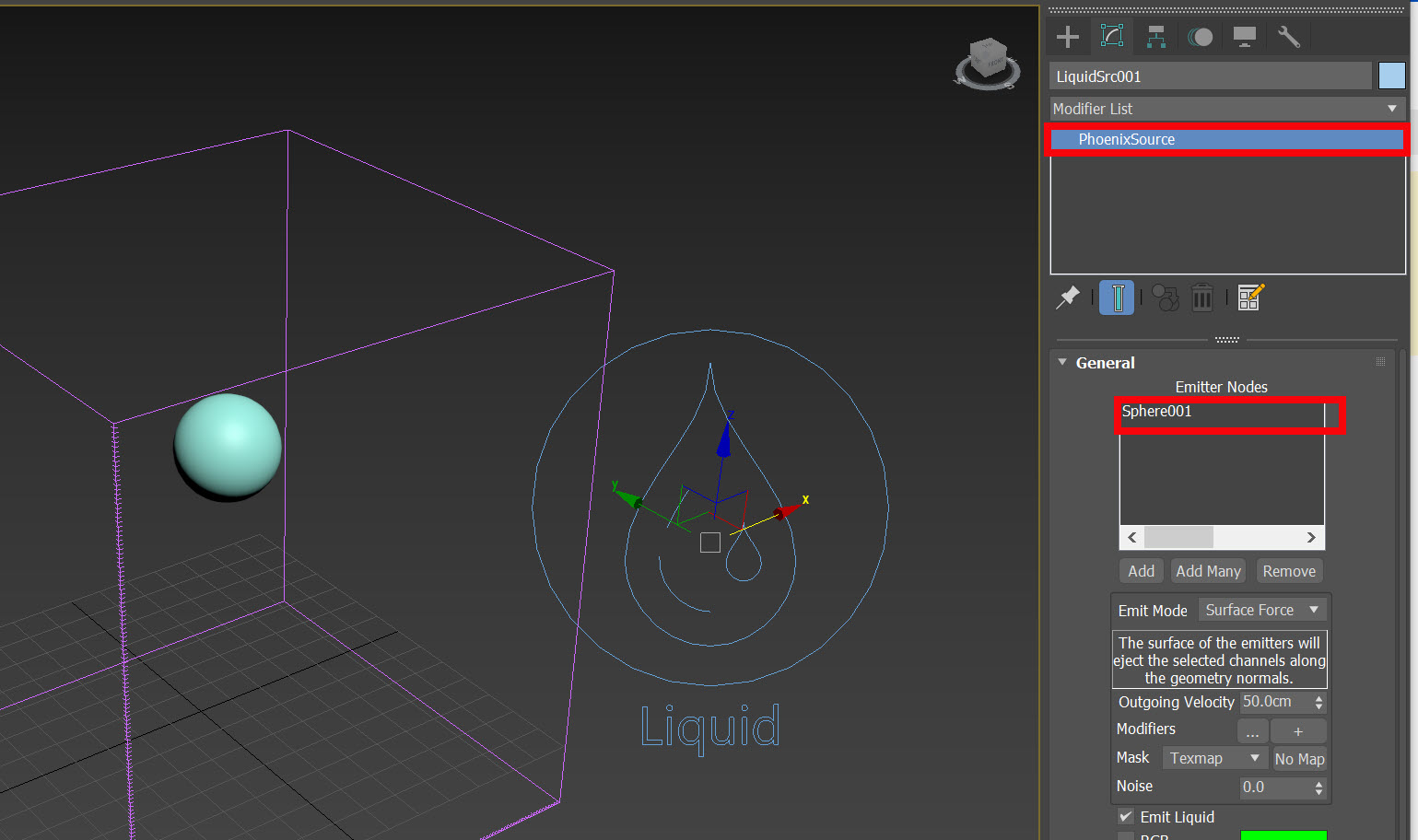 7)LiquidSrc(phoenixSource) 오브젝트의 general에서 add를 클릭하여 소스로 사용할 오브젝트(sphere)를 추가합니다.