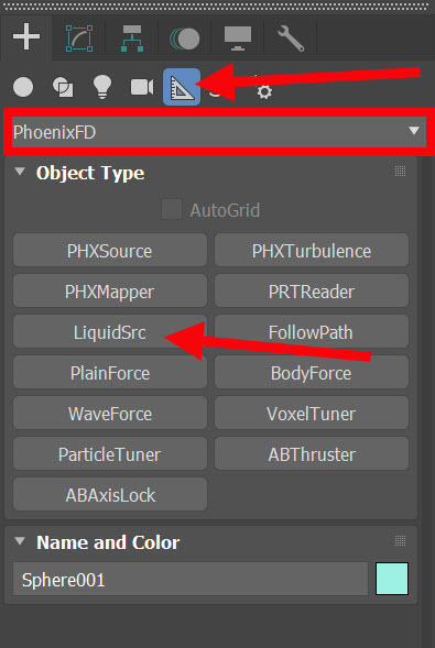 6)helpers의 phoenixFD에서 LiquidSrc를 선택 및 씬에 생성합니다.
