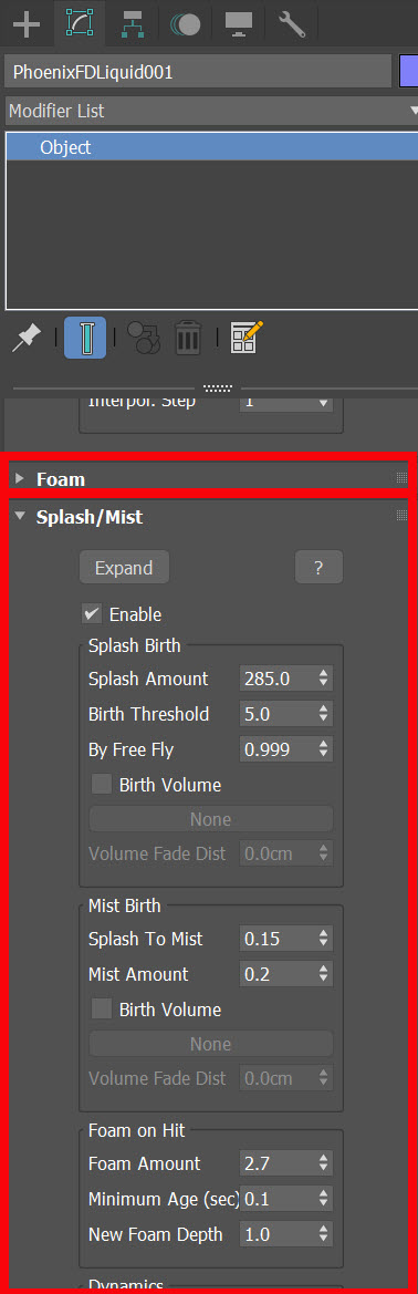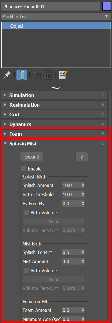 35)폭포 시뮬레이션에서 사용되는 오브젝트의 추가 속성(foam, splash/mist)들을 확인하고 참고할수있습니다.