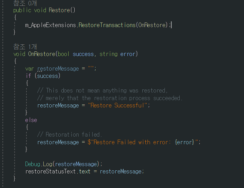 유니티 인앱결제(Unity In-App Purshasing, IAP) 구매 복원(Restore) 구현(안드로이드, iOS)