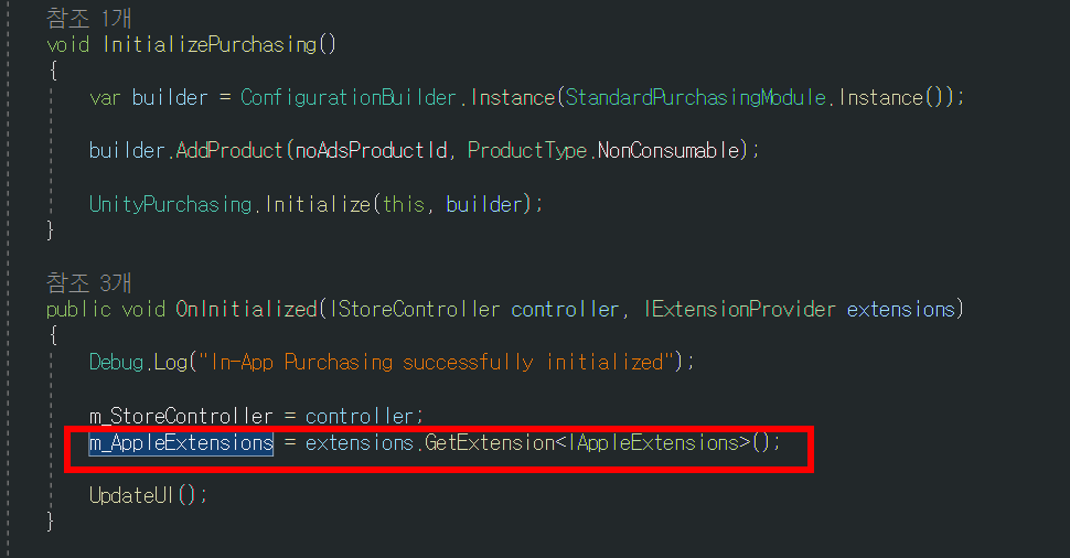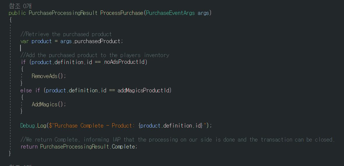 비소모품 구매 이력이 존재하는 경우 해당 상품에 대하여 ProcessPurchase 함수가 호출되며 함수내에서 상품 구매 완료이후의 로직을 실행합니다.