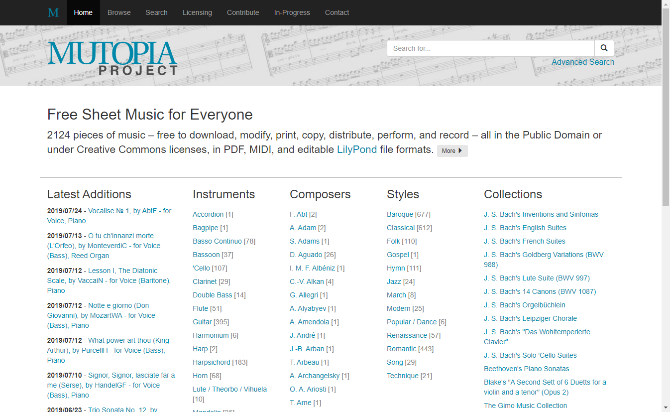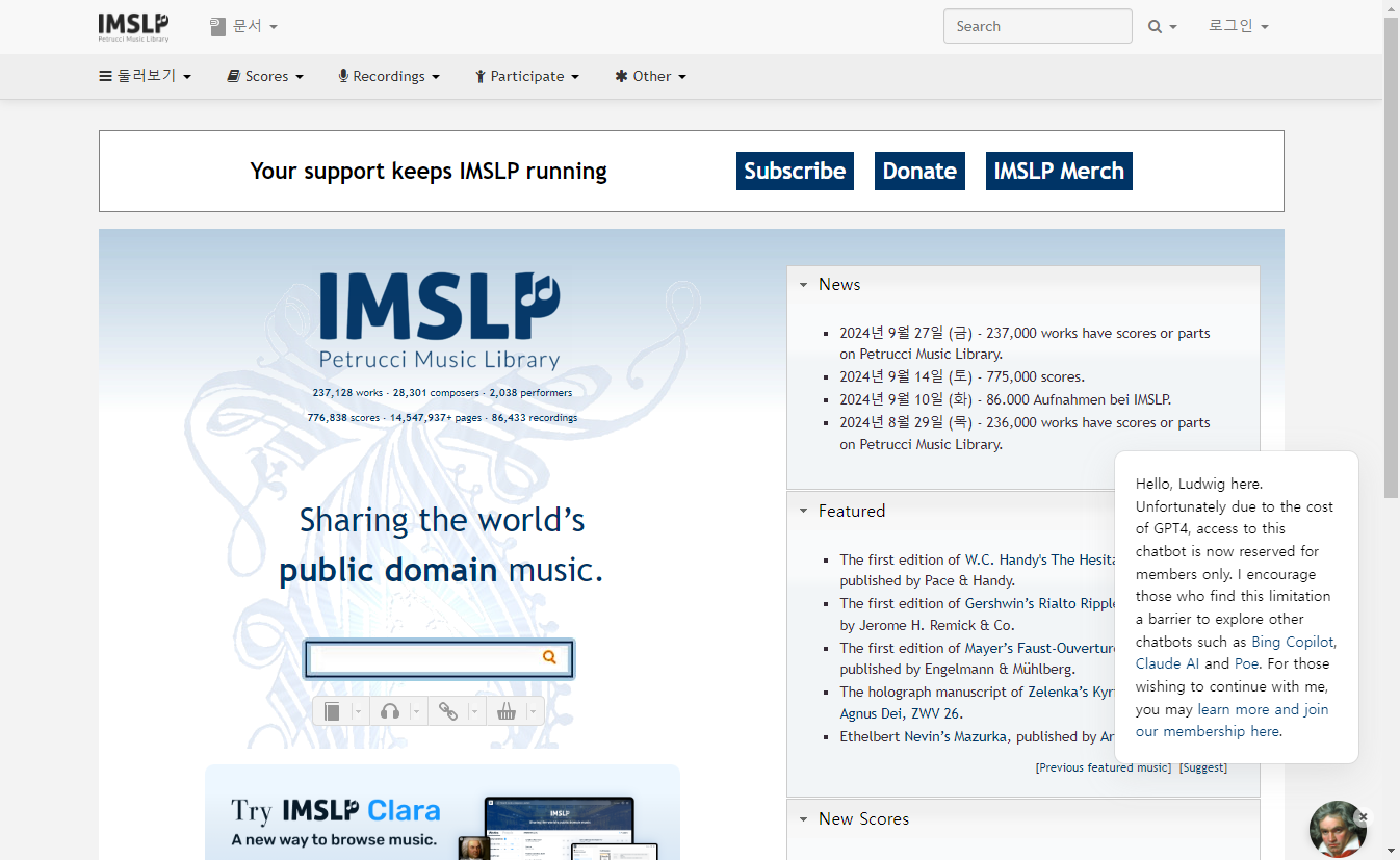 다양한 악기 및 장르의 악보 , 공공 도메인에 속하는 고전(클래식) 음악 악보, 사용이 허가된 악보, 커뮤니티에서 공유된 악보등 다양한 악보를 무료로 제공하는 웹사이트 모음