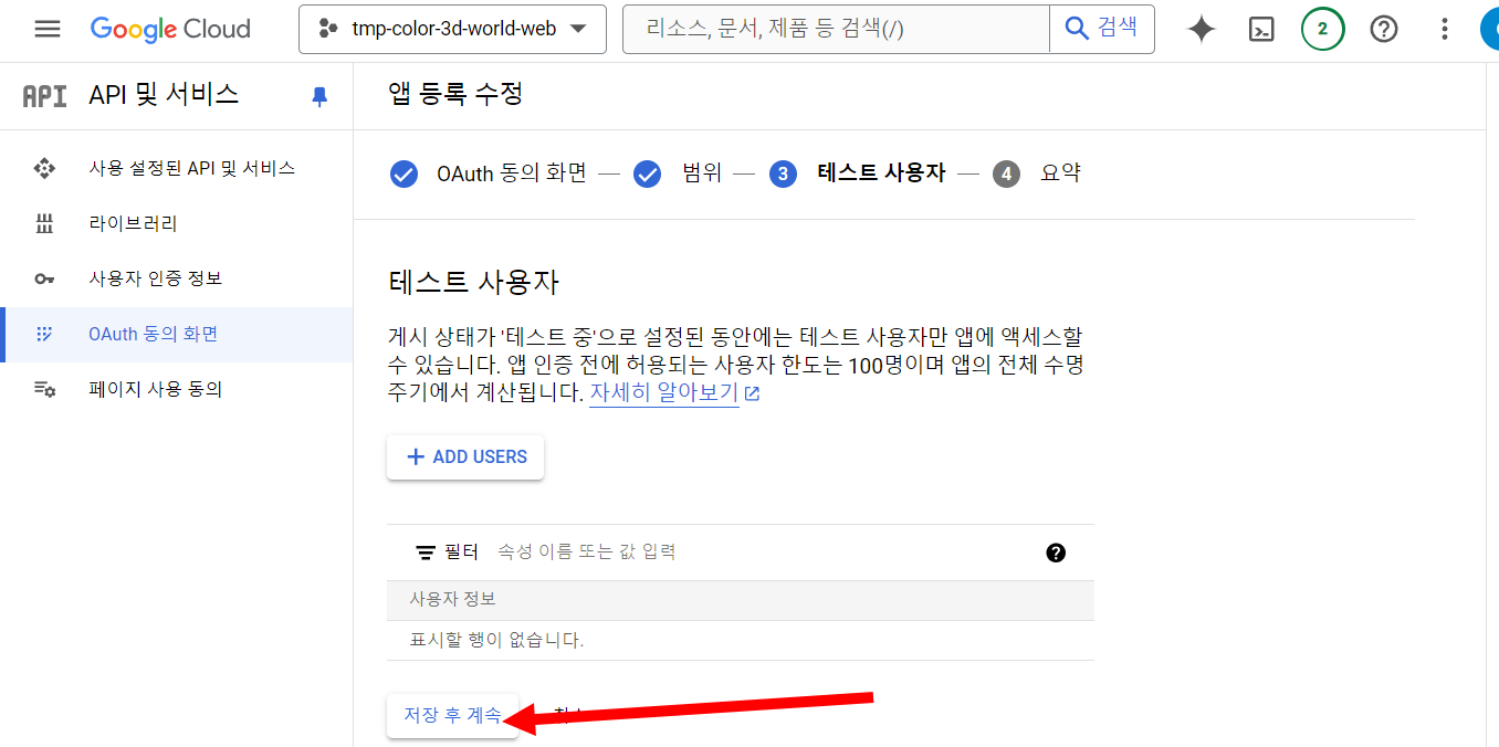 13)테스트 사용자를 추가하고 저장후 계속으로 이동합니다(선택)