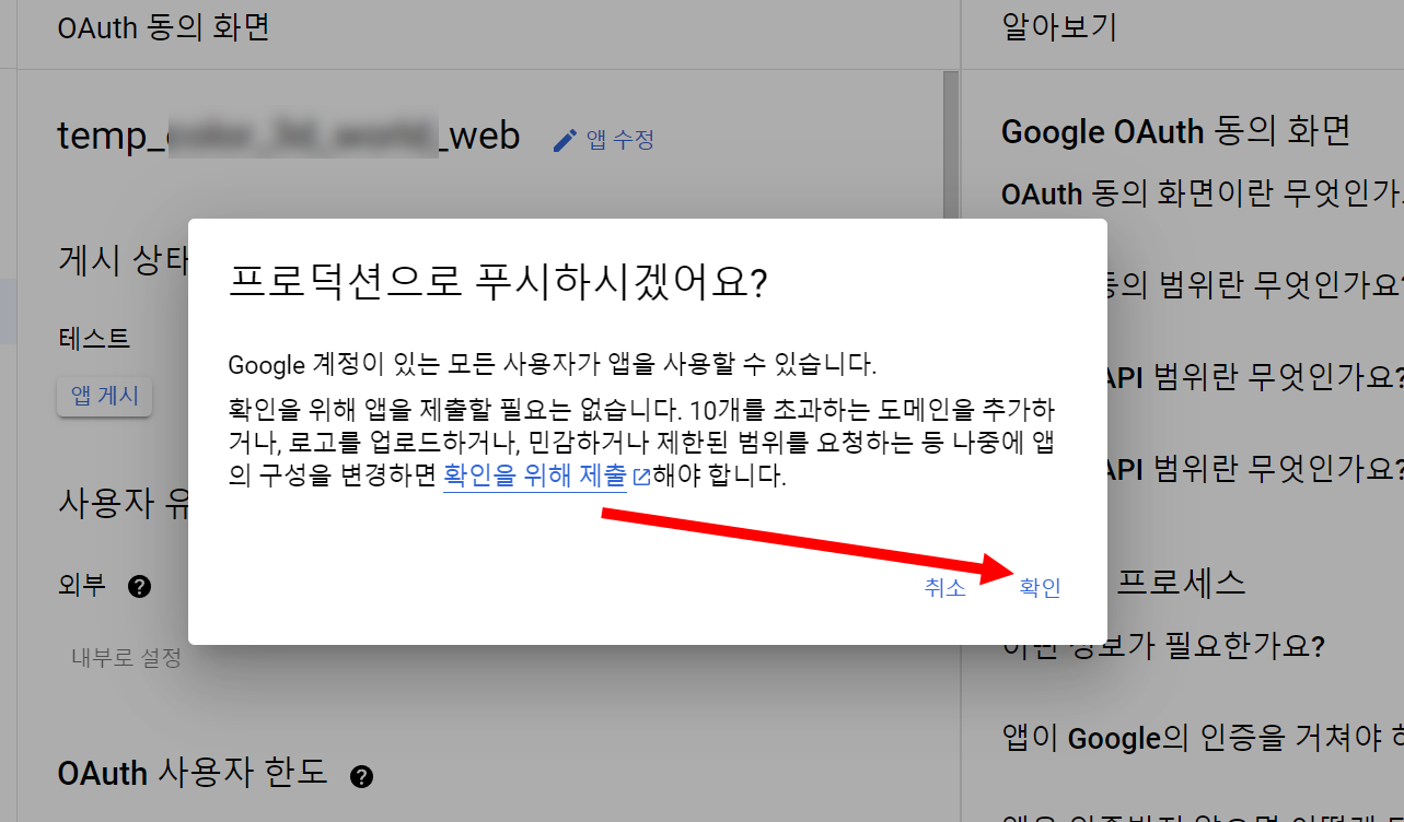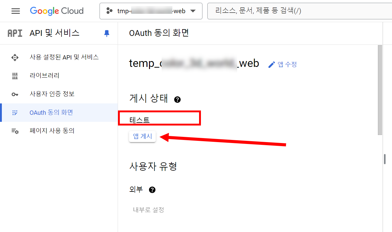 구글 계정이 있는 모든 사용자가 서비스를 이용할수있게 설정하려면 앱 게시를 선택합니다.