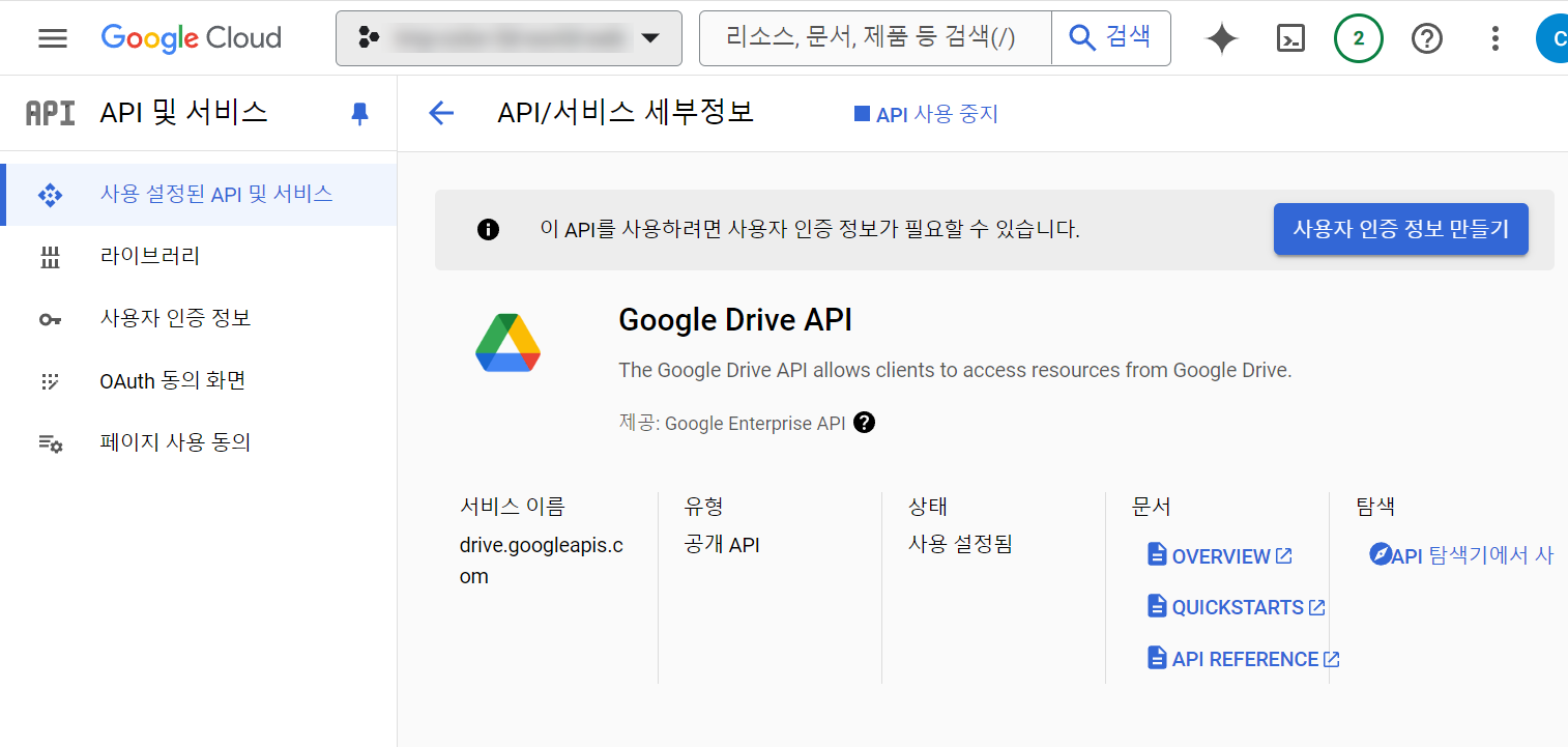 8)구글 드라이브 API가 사용 설정된것을 확인할수있습니다.