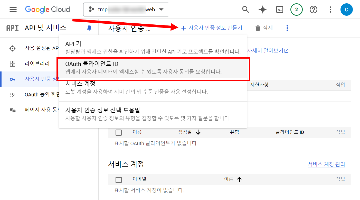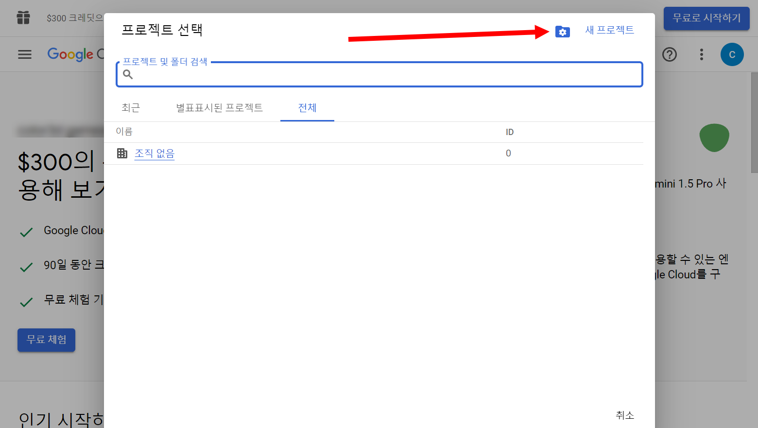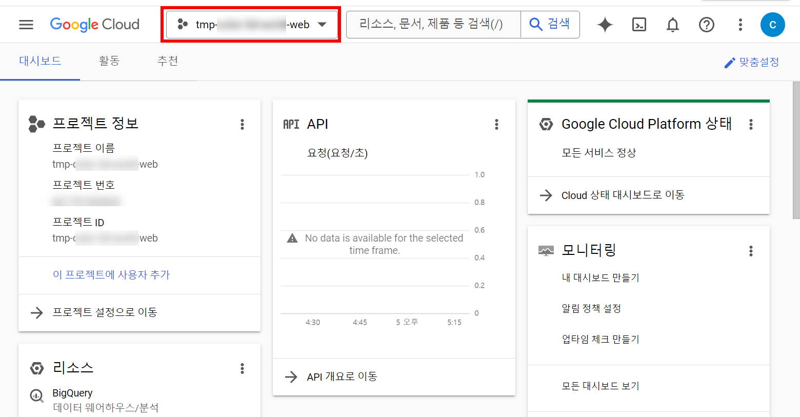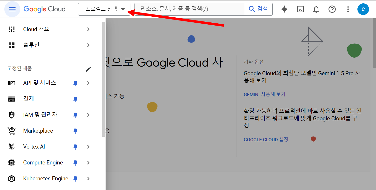 1)구글 클라우드 플랫폼 콘솔에서 상단의 프로젝트 선택으로 이동합니다.