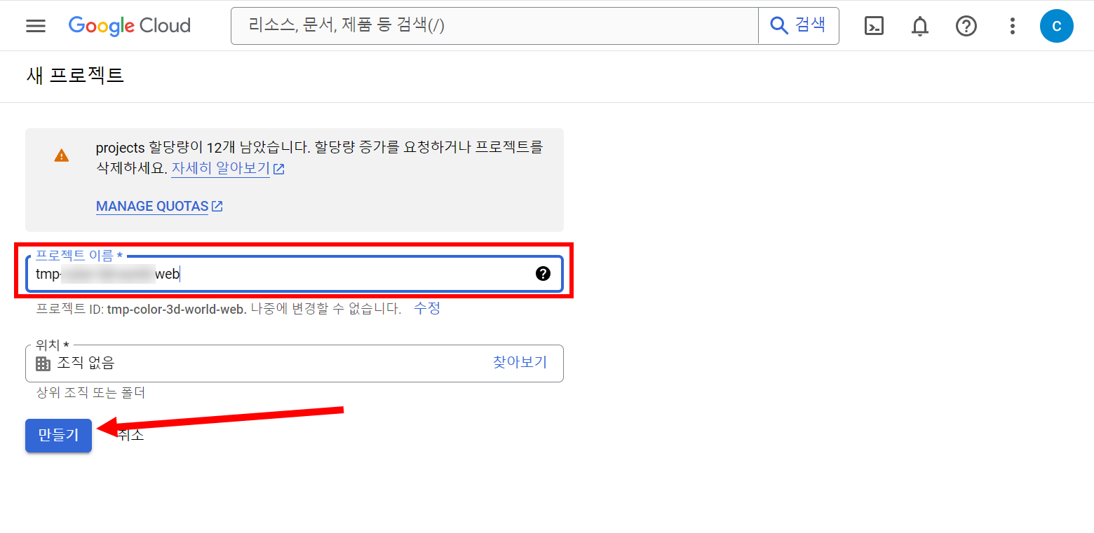 3)프로젝트 이름 및 조직을 설정하고 만들기를 클릭합니다.