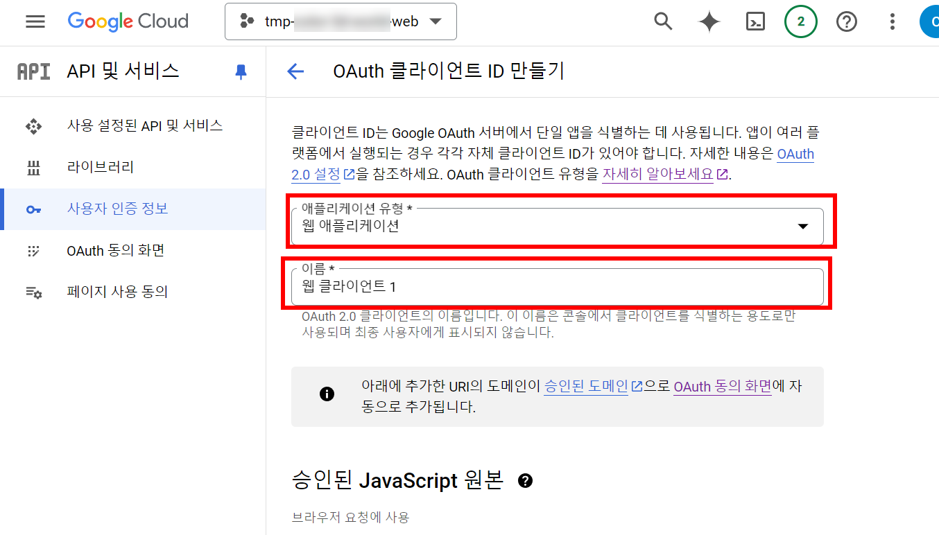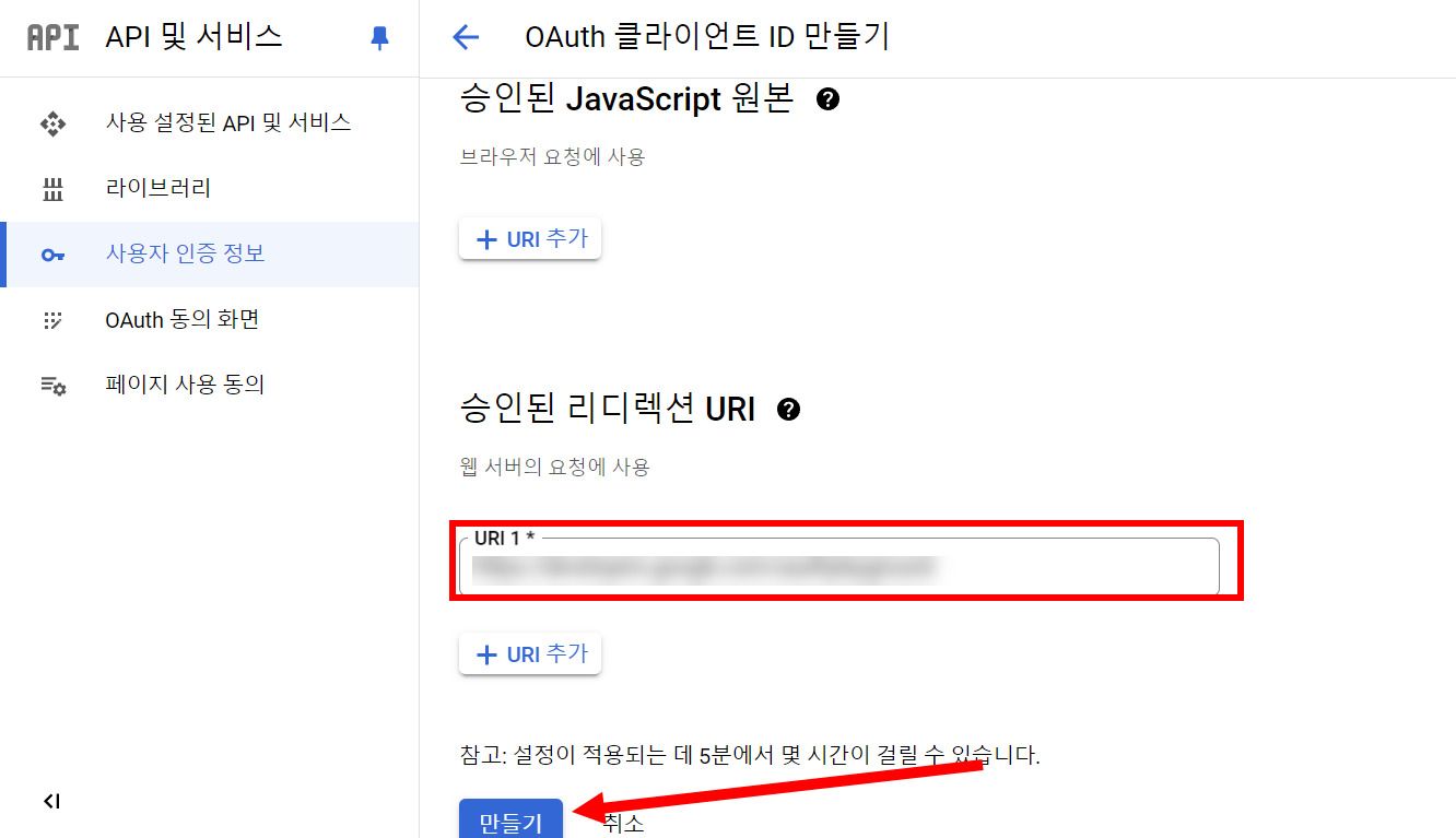 21)승인된 자바스크립트(JavaScript) 원본, 승인된 리디렉션 URI를 입력하고 만들기를 클릭합니다(선택)