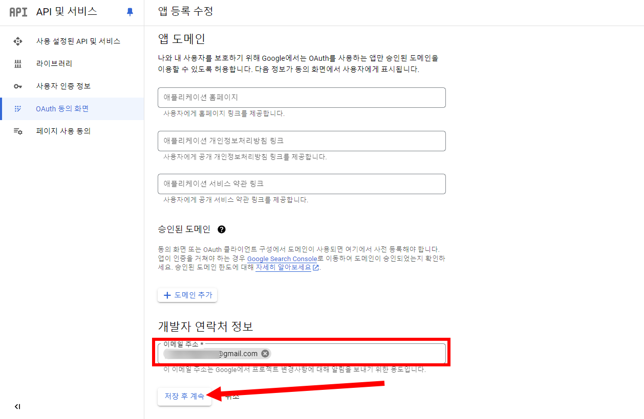 11)앱 도메인(선택) 및 개발자 연락처 정보를 입력하고 저장후 계속으로 이동합니다.