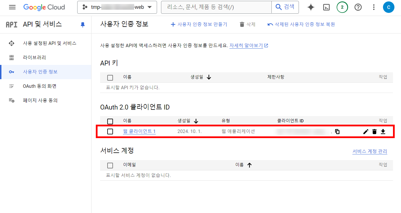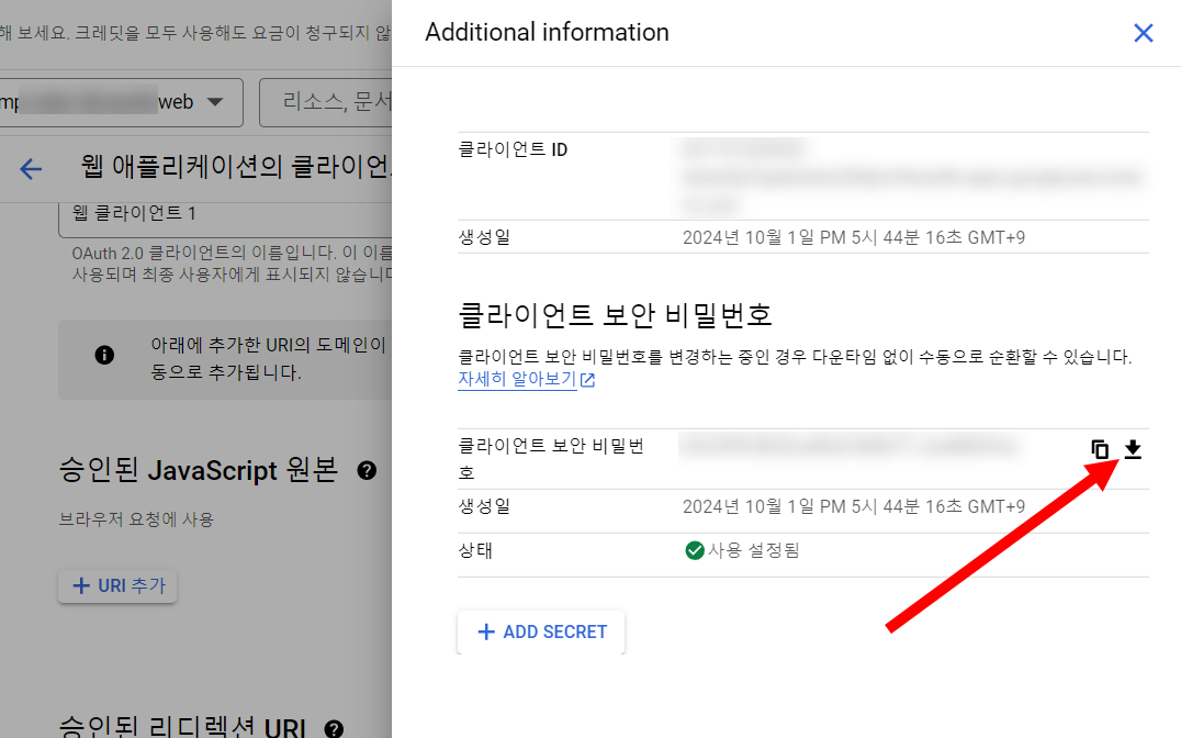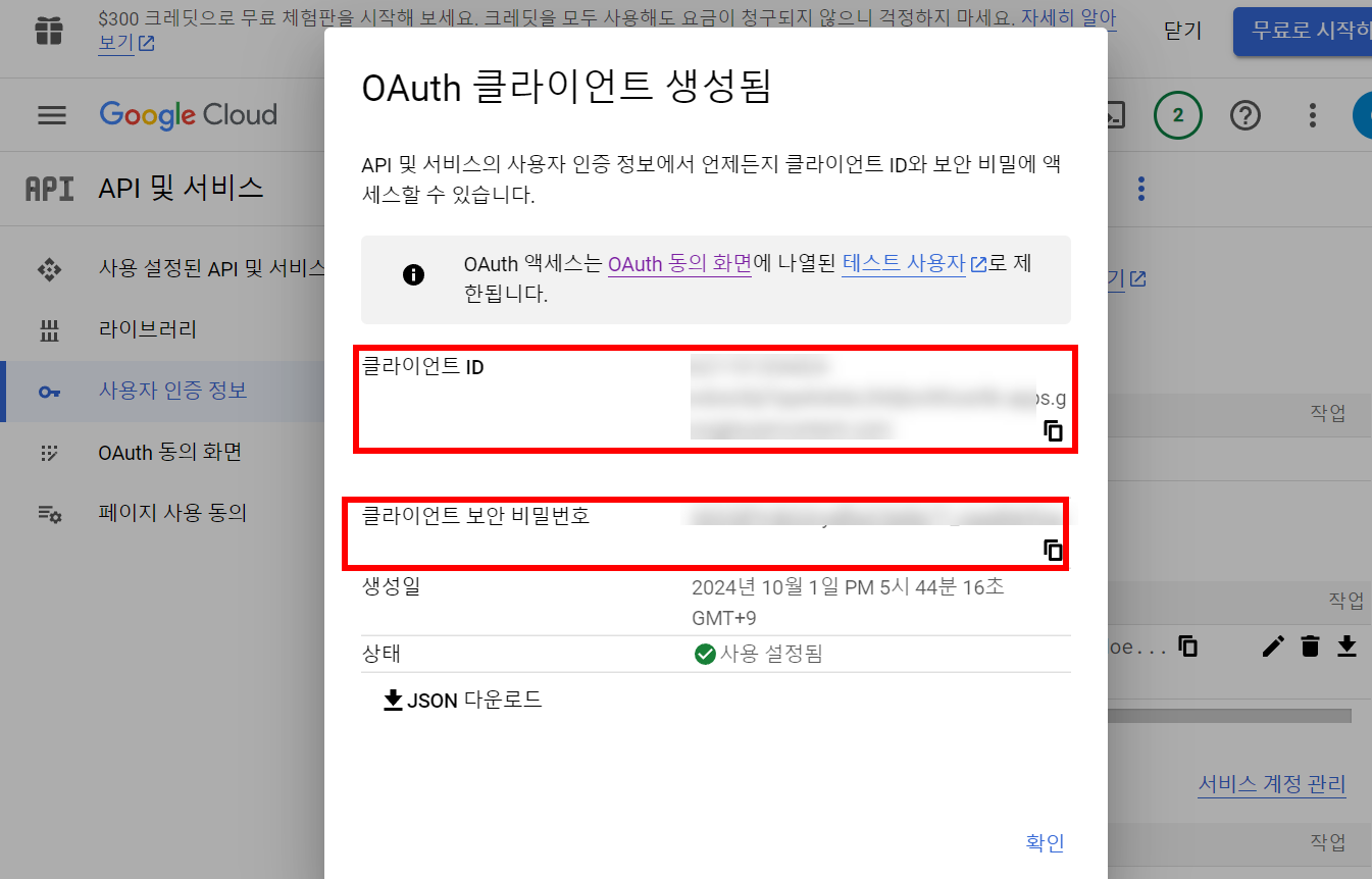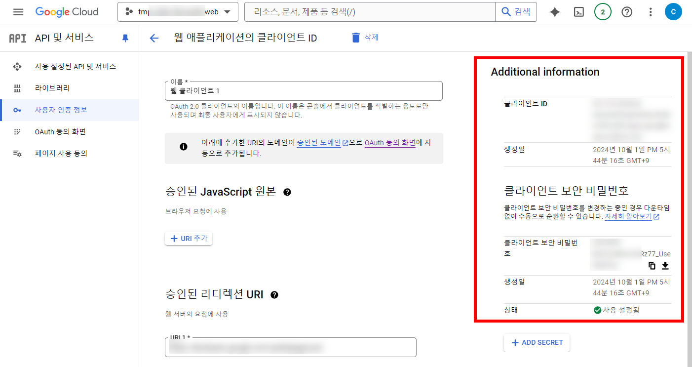 24)OAuth 클라이언트를 선택하면 클라이언트 ID와 보안 비밀번호를 확인할수있습니다.