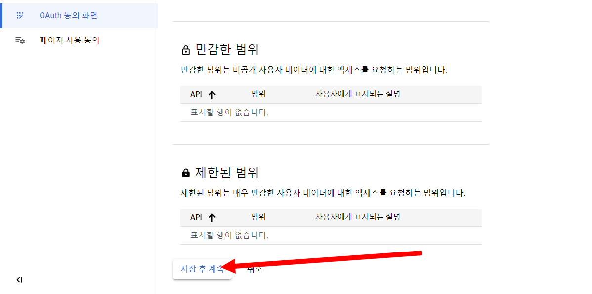 12)범위(scope)를 설정하고 저장후 계속으로 이동합니다(선택)