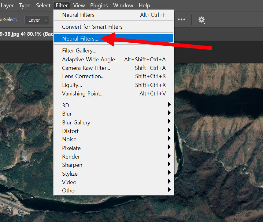 포토샵에서 neural filter를 사용하여 구글어스 위성 사진 보정