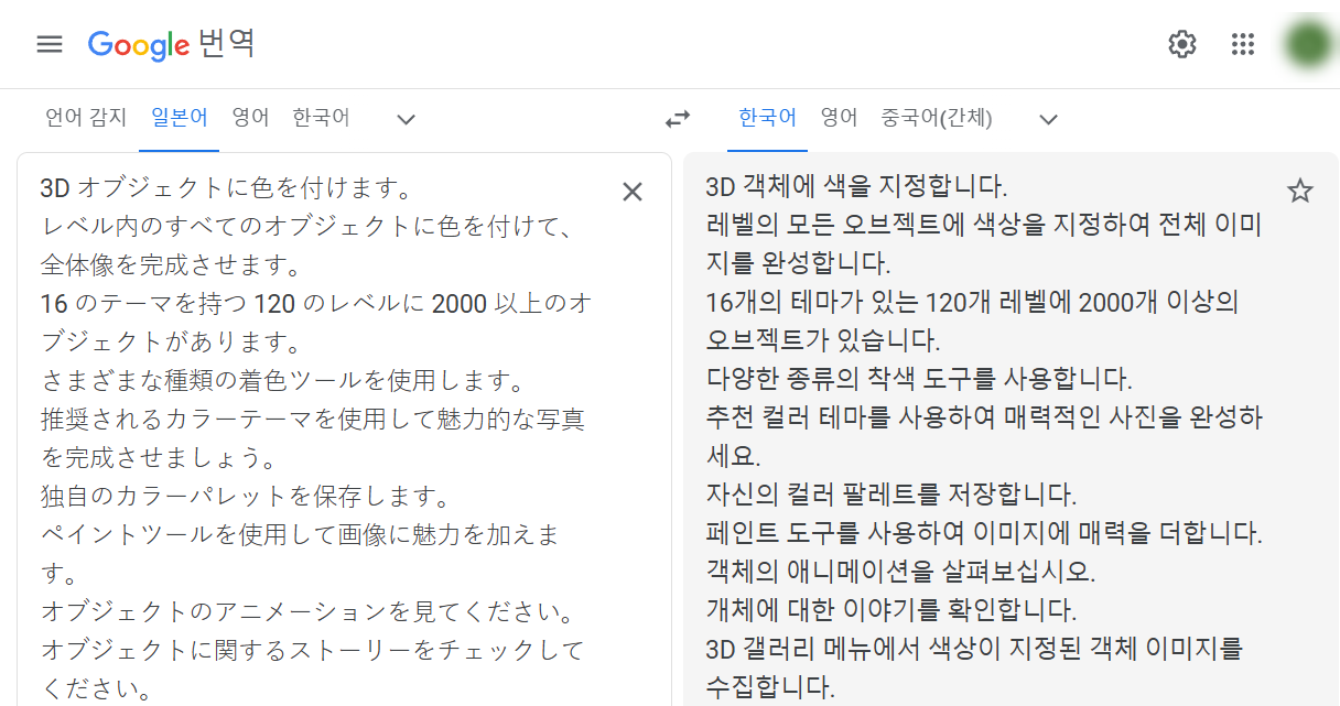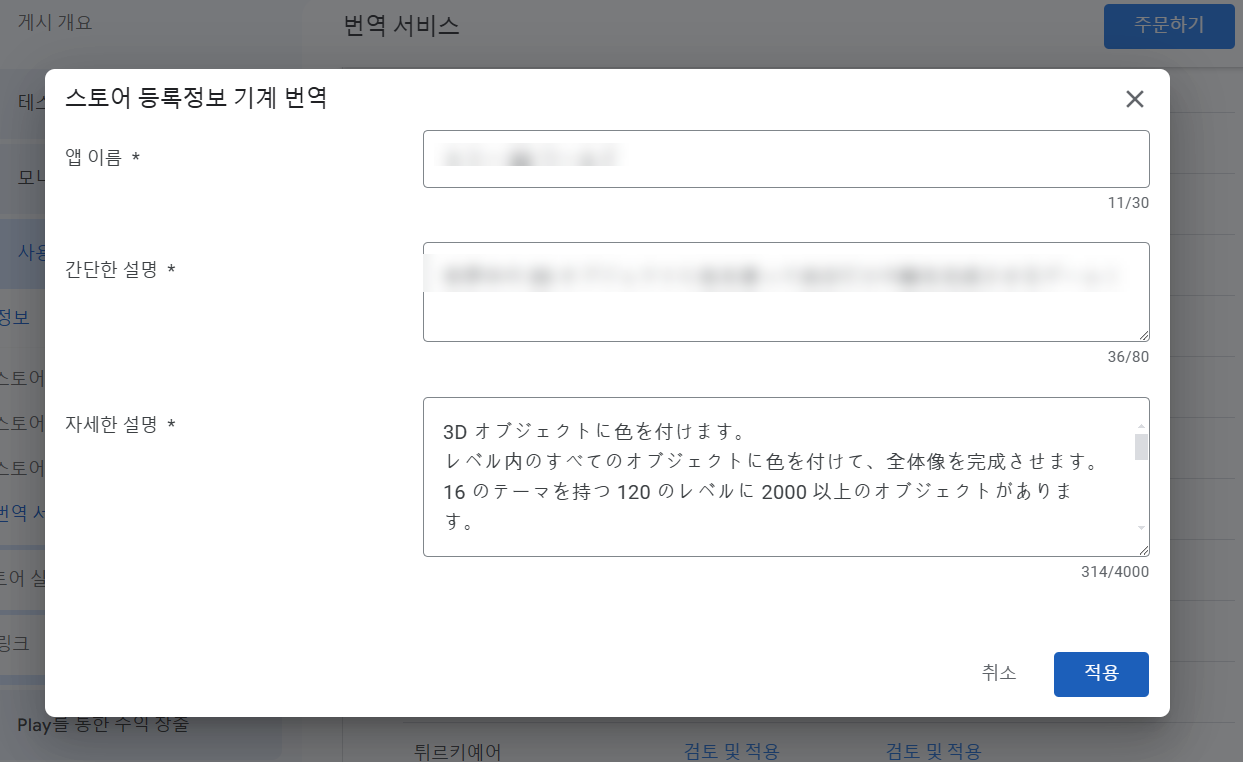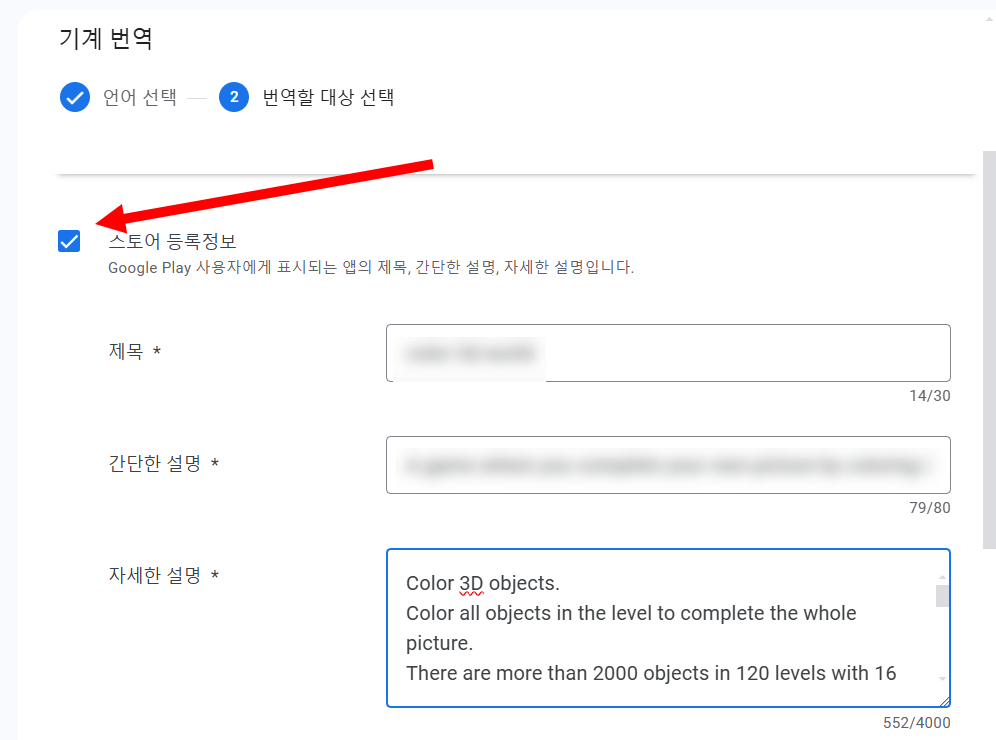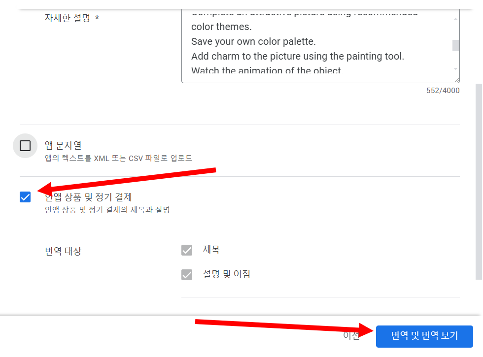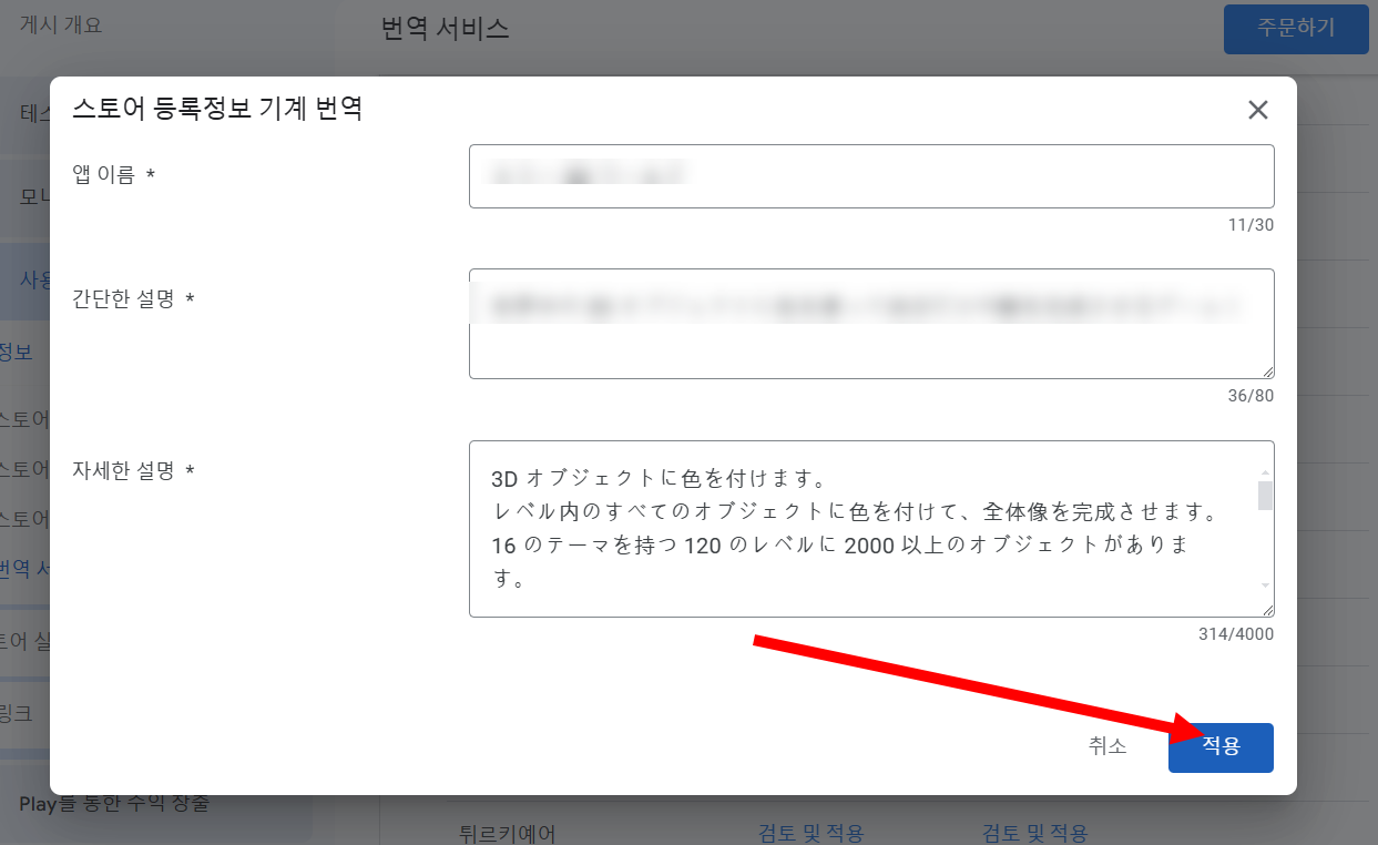 14)스토어 등록정보(앱 이름, 간단한 설명, 자세한 설명)를 대상 언어로 번역한 결과를 확인합니다.