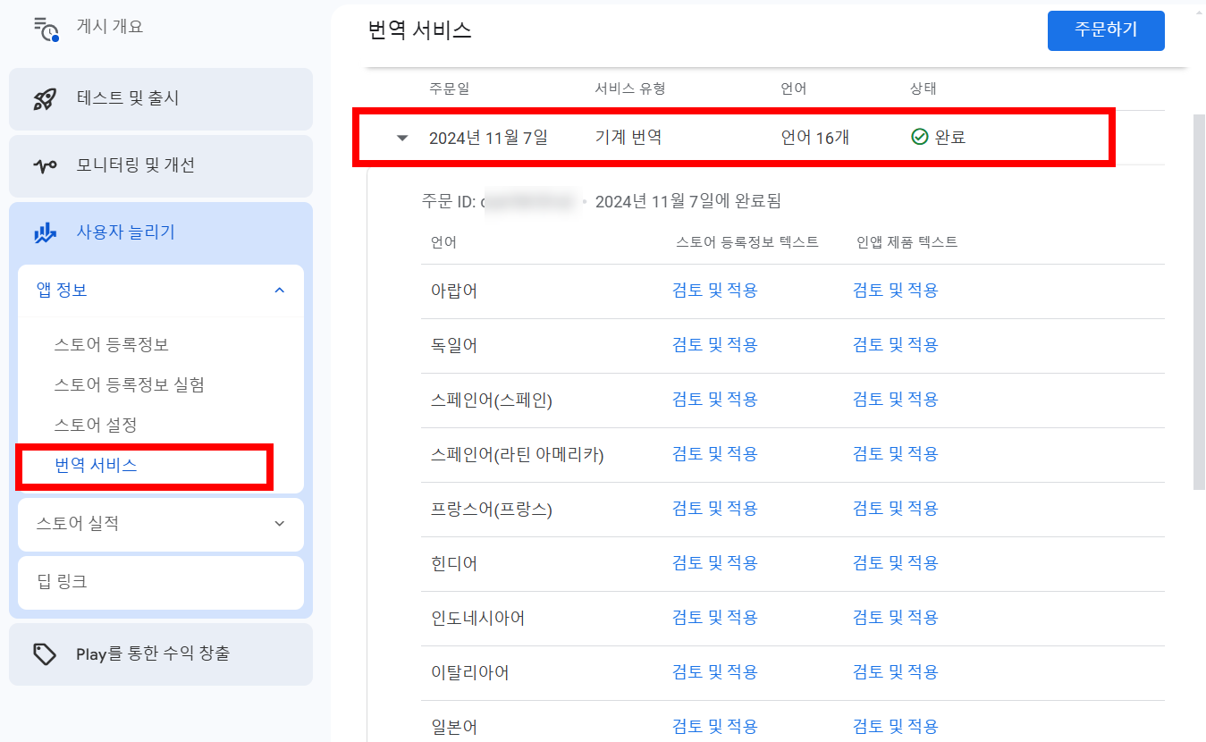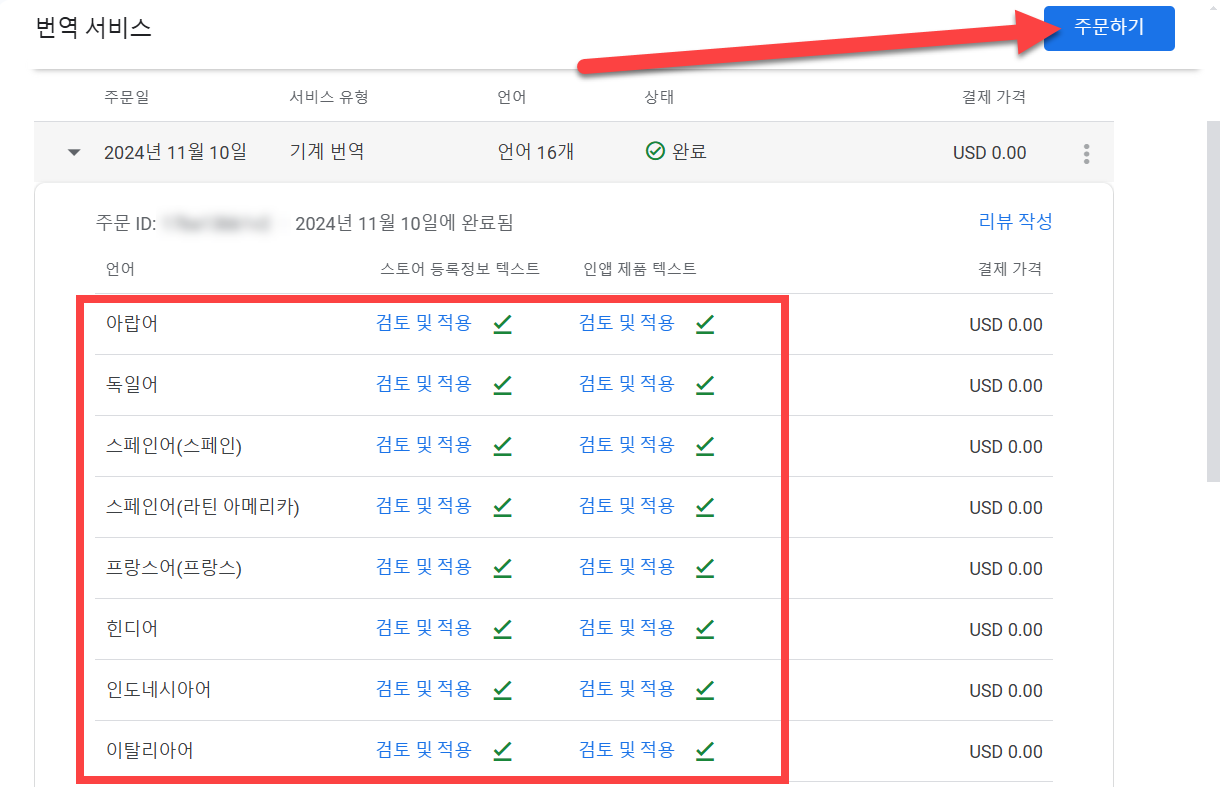 18)같은 방법으로 모든 대상 언어에 대하여 번역 결과를 검토 및 적용을 완료하고 주문하기를 클릭합니다.