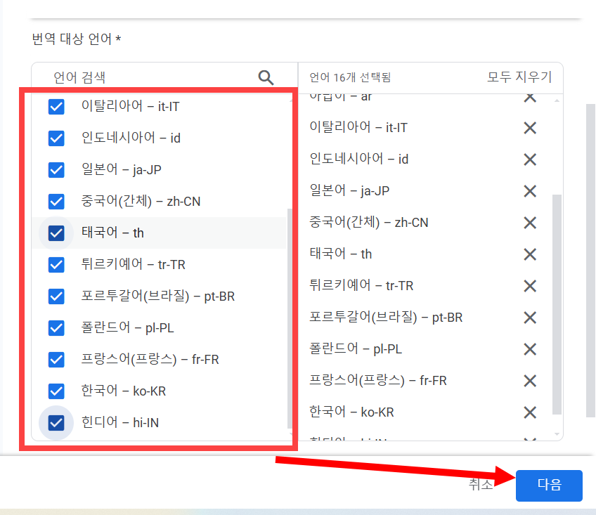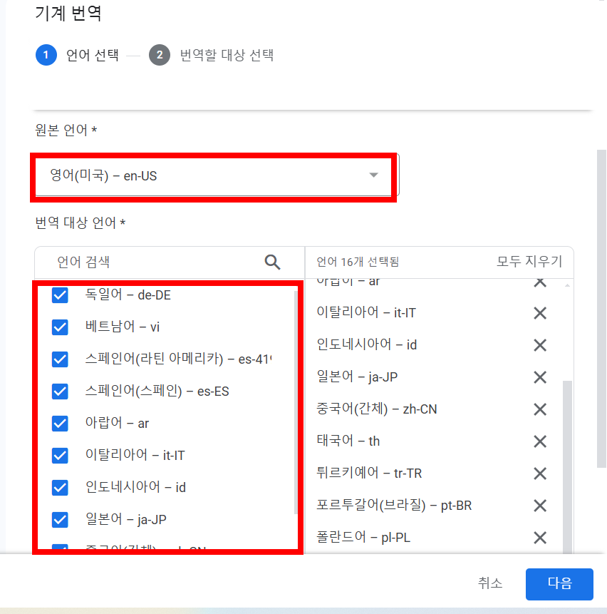 7)대상 언어로 번역할 원본 언어와 번역 대상 언어를 모두 선택하고 다음으로 이동합니다.