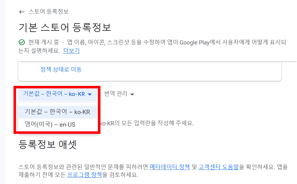 3)현재 기본 스토어 등록정보 언어가 기본값인 한국어(ko-KR)와 추가 선택 언어인 영어(미국, en-US)로 설정되어있는것을 확인할수있습니다.