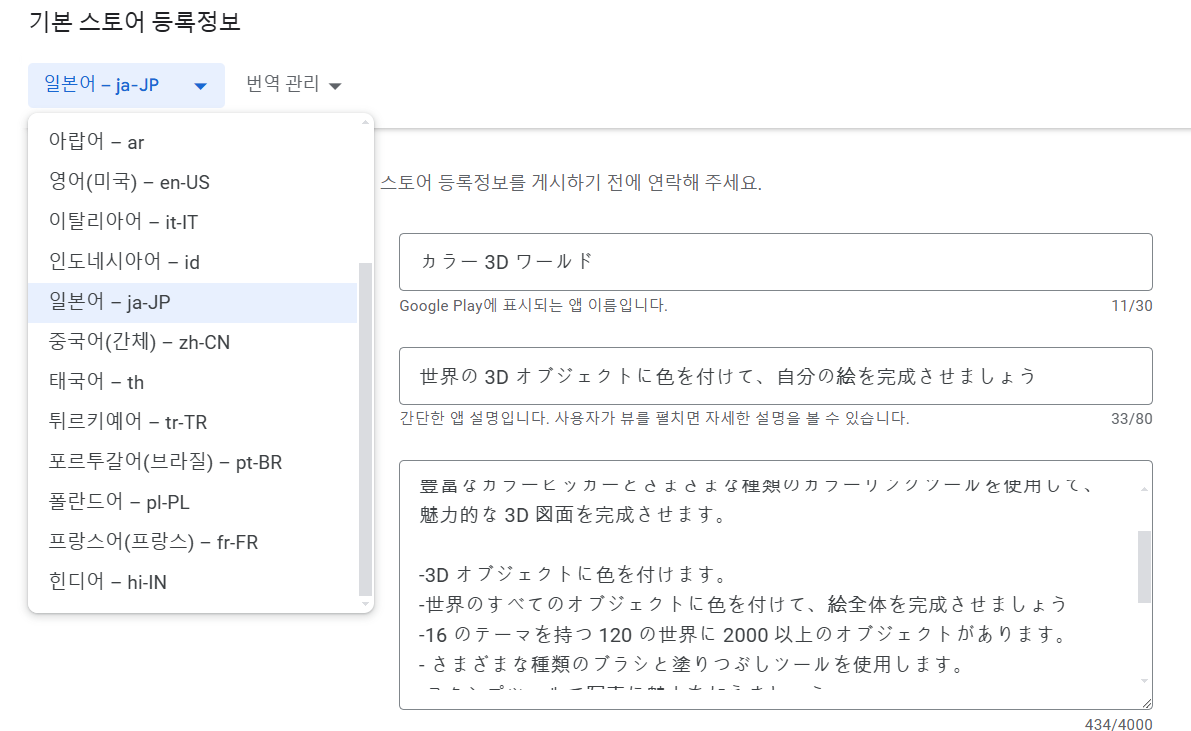 9)스토어 등록정보에 체크하면 원본 언어로 작성한 스토어 등록정보(제목, 간단한 설명, 자세한 설명)를 확인할수있습니다.