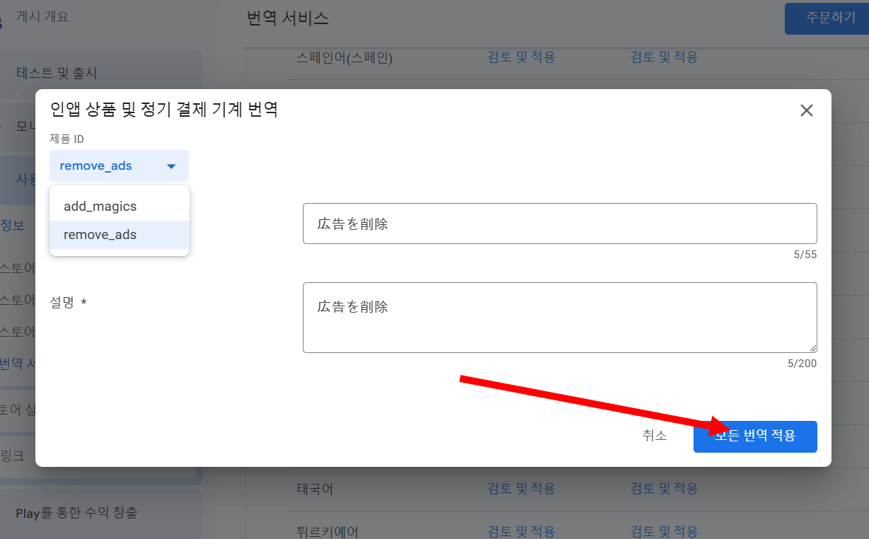 17)같은 방법으로 인앱 제품 텍스트의 번역을 확인 및 적용합니다.