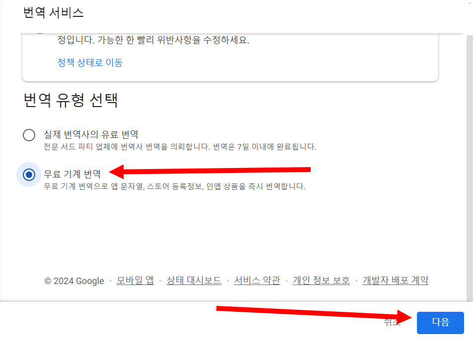 6)번역 유형 선택에서 무료 기계 번역을 선택하고 다음으로 이동합니다.