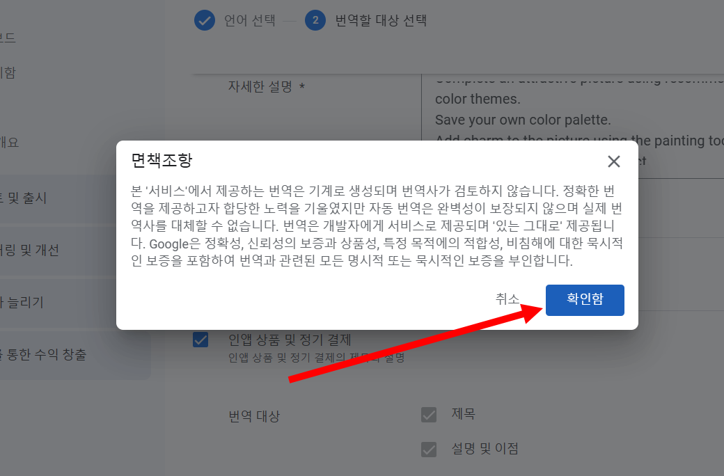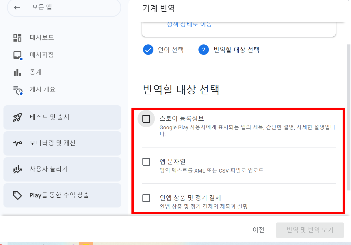 8)번역할 대상 선택을 확인합니다(스토어 등록정보, 앱 문자열, 인앱 상품 및 정기 결제)