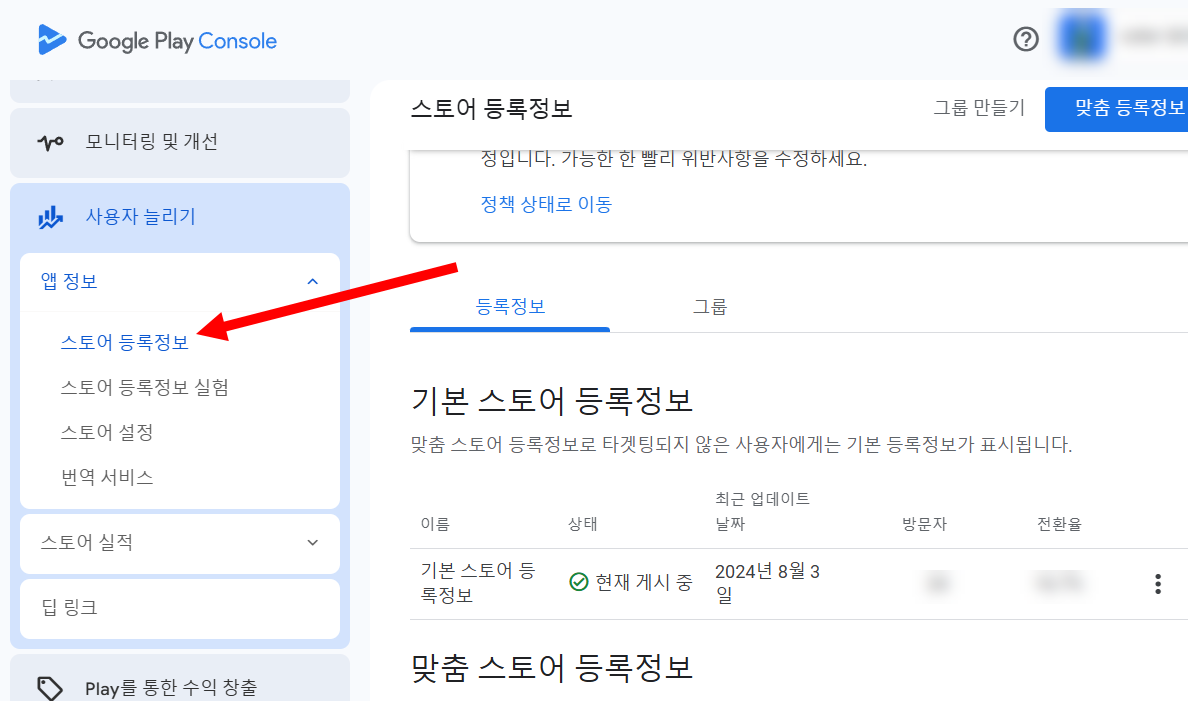 1)구글 플레이 콘솔에서 사용자 늘리기의 스토어 등록정보로 이동합니다.