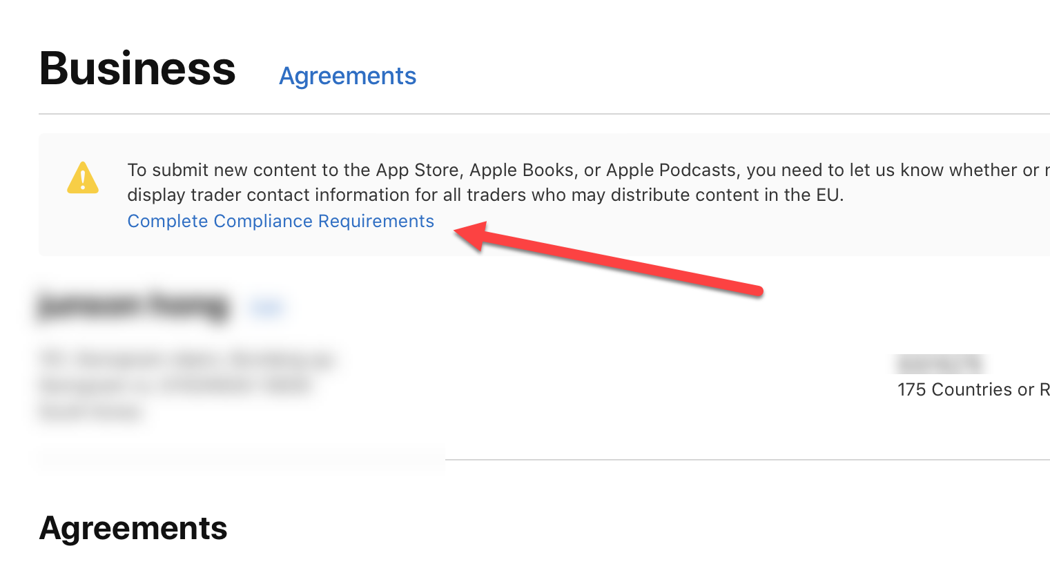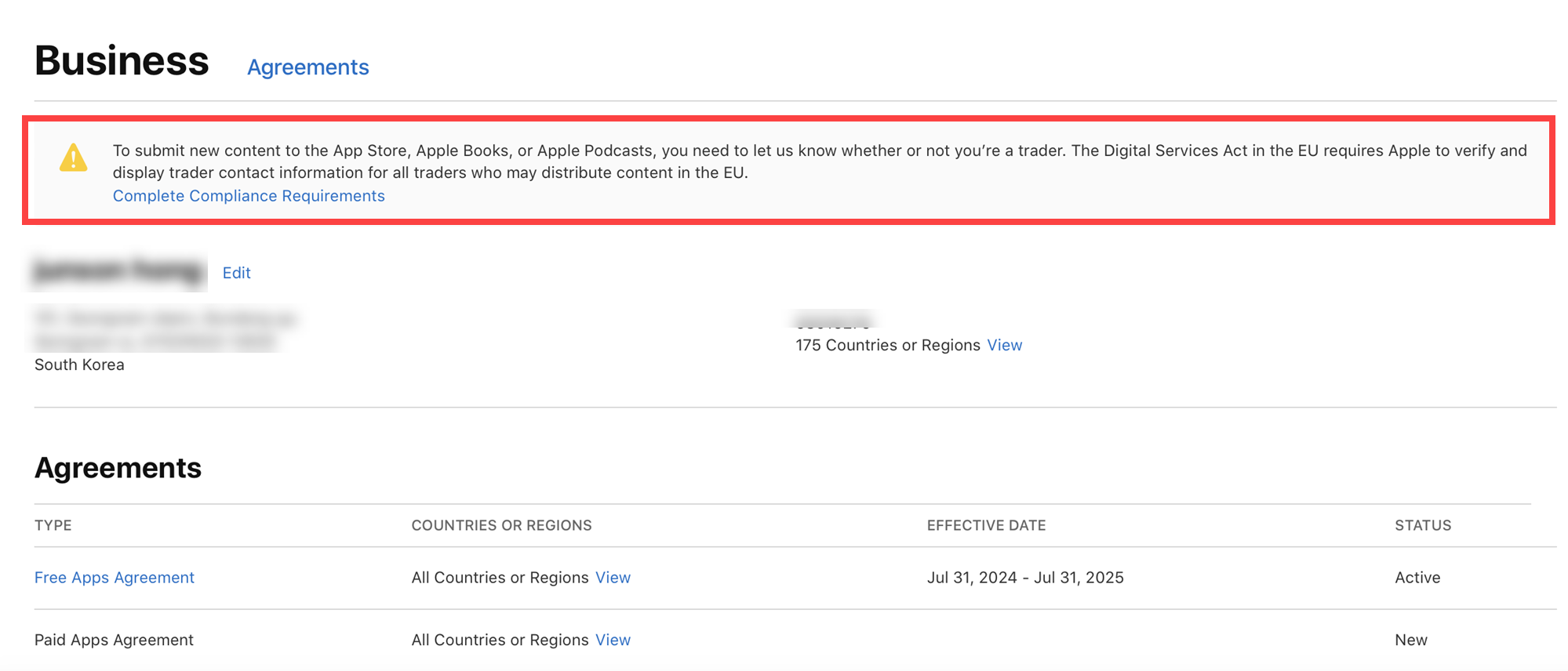 1)EU의 디지털 서비스법(DSA, digital services act)에 따라 Apple은 유럽 연합(EU) 내 앱스토어(App Store)에서 앱을 배포하는 모든 거래자의 연락처 정보를 확인하고 표시해야 합니다. complete compiliance requirements로 이동합니다.