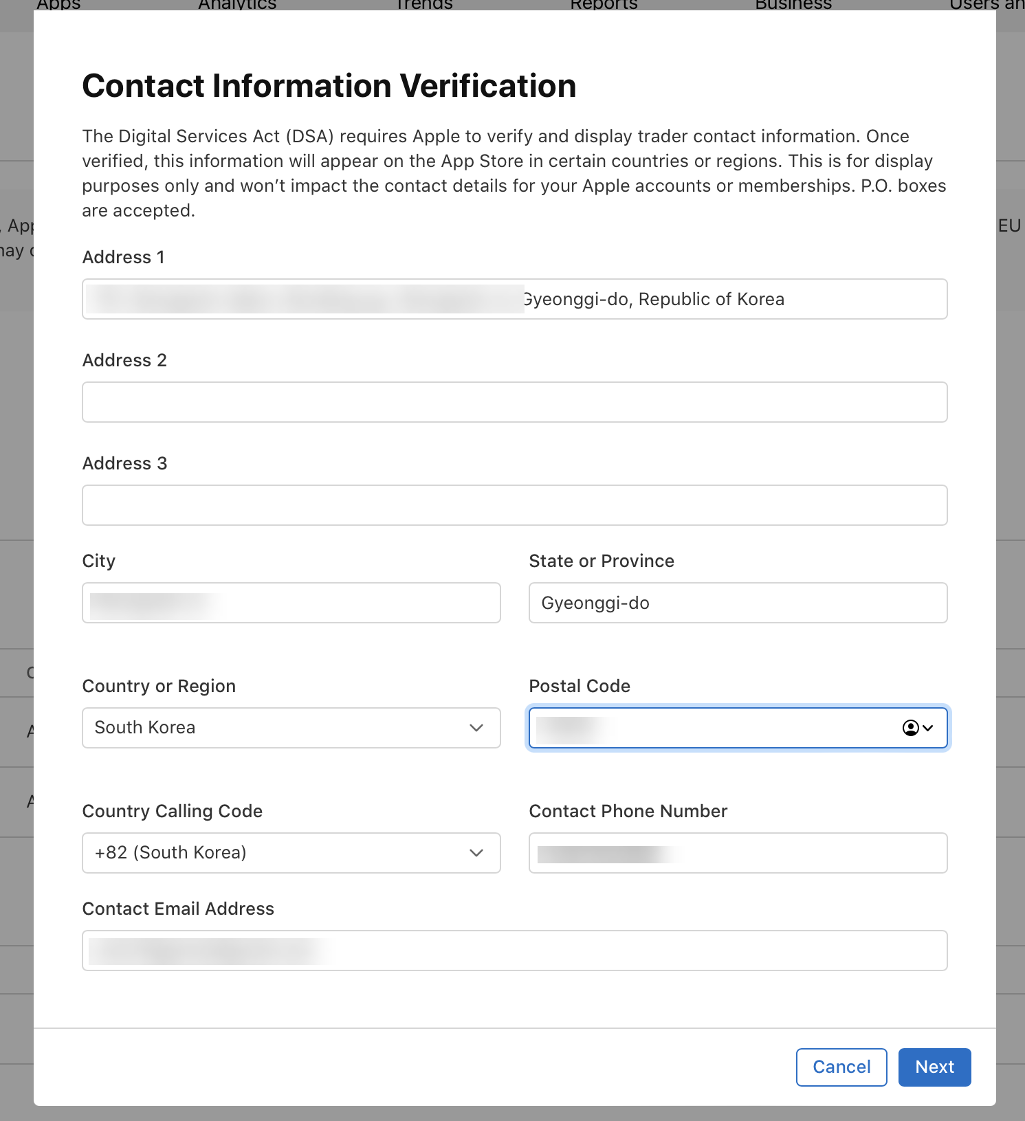 3)거래자 자격으로 배포하는 경우 EU의 디지털 서비스법에 따라 제공해야하는 주소, 전화번호, 이메일 주소등의 Contact Information Verification(거래자 연락처 정보)를 입력합니다. 이 정보는 오직 앱스토어의 제품 페이지에 표시할 목적으로 사용됩니다.