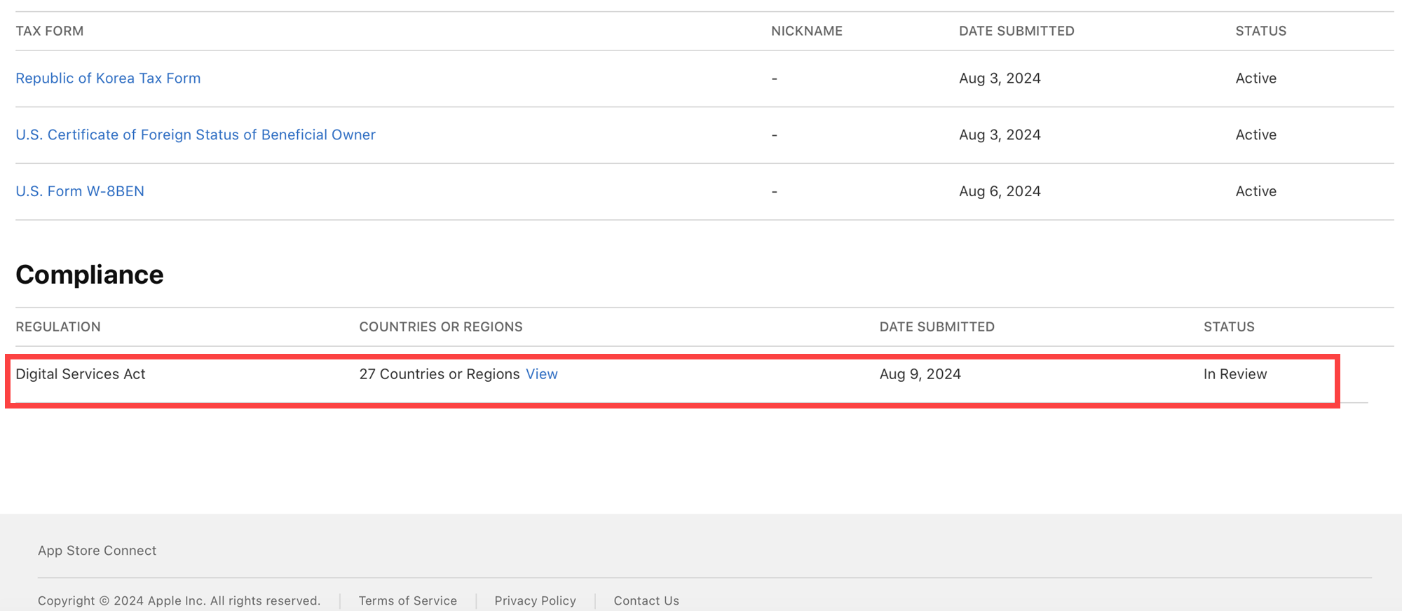 8)DSA(Digital Services Act)가 추가되었으며 검토중(In Review) 상태인것을 확인할수있습니다.