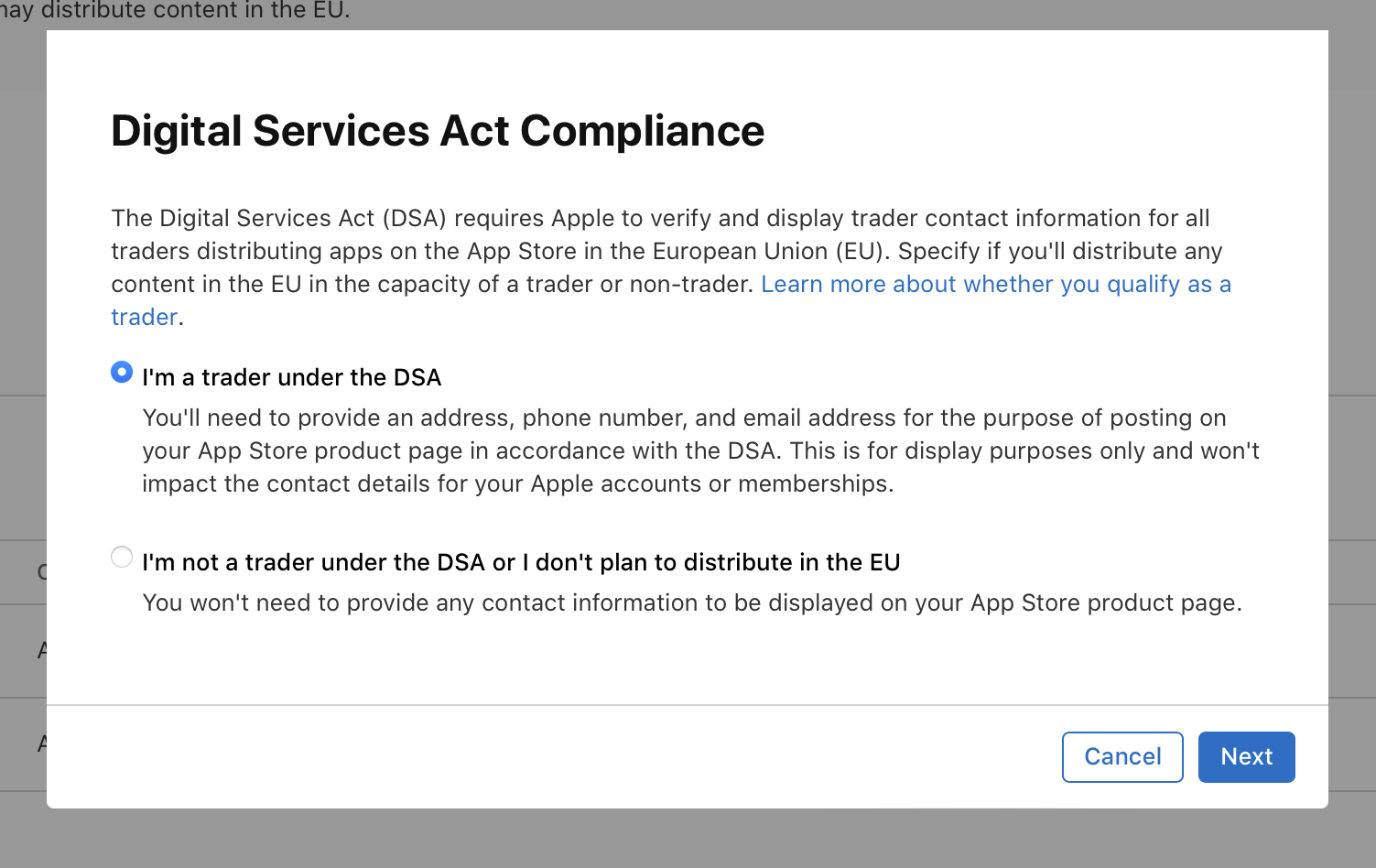 iOS 앱 배포 - App Store Connect에서 EU의 디지털 서비스법(DSA) 규정 준수확인