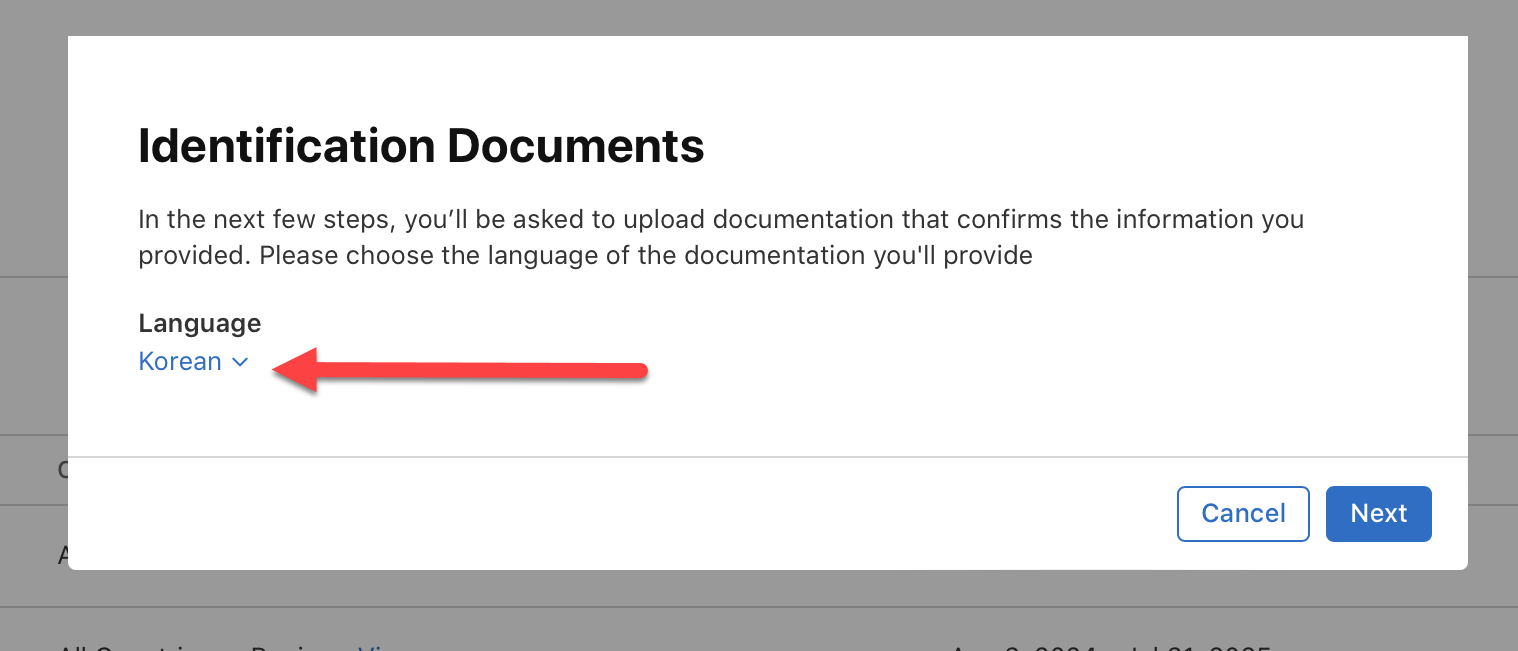 5)Identification Documents(신분 증명서)에서 거래자 정보를 확인하는 문서를 업로드하라는 메시지가 표시됩니다. 제공할 문서의 언어를 선택하고 다음으로 이동합니다.