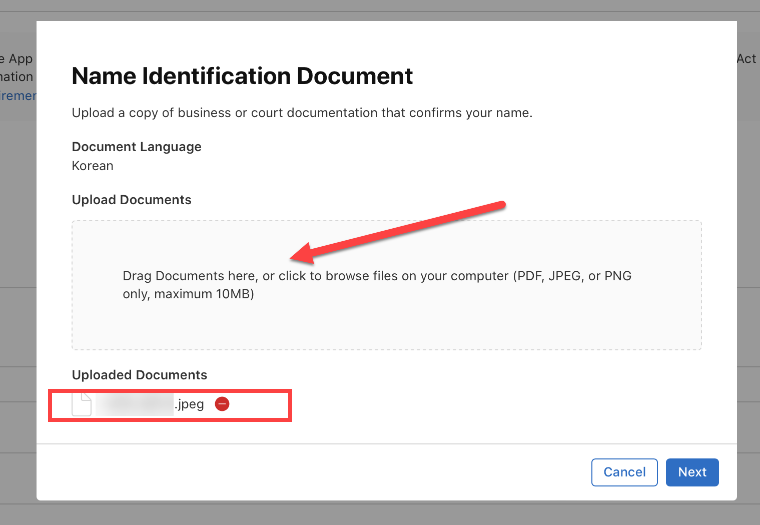 6)신분 증명서를 업로드합니다(PDF, JPEG, PNG형식, 최대10MB)