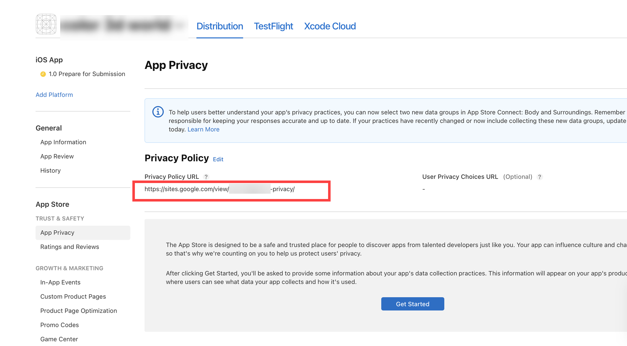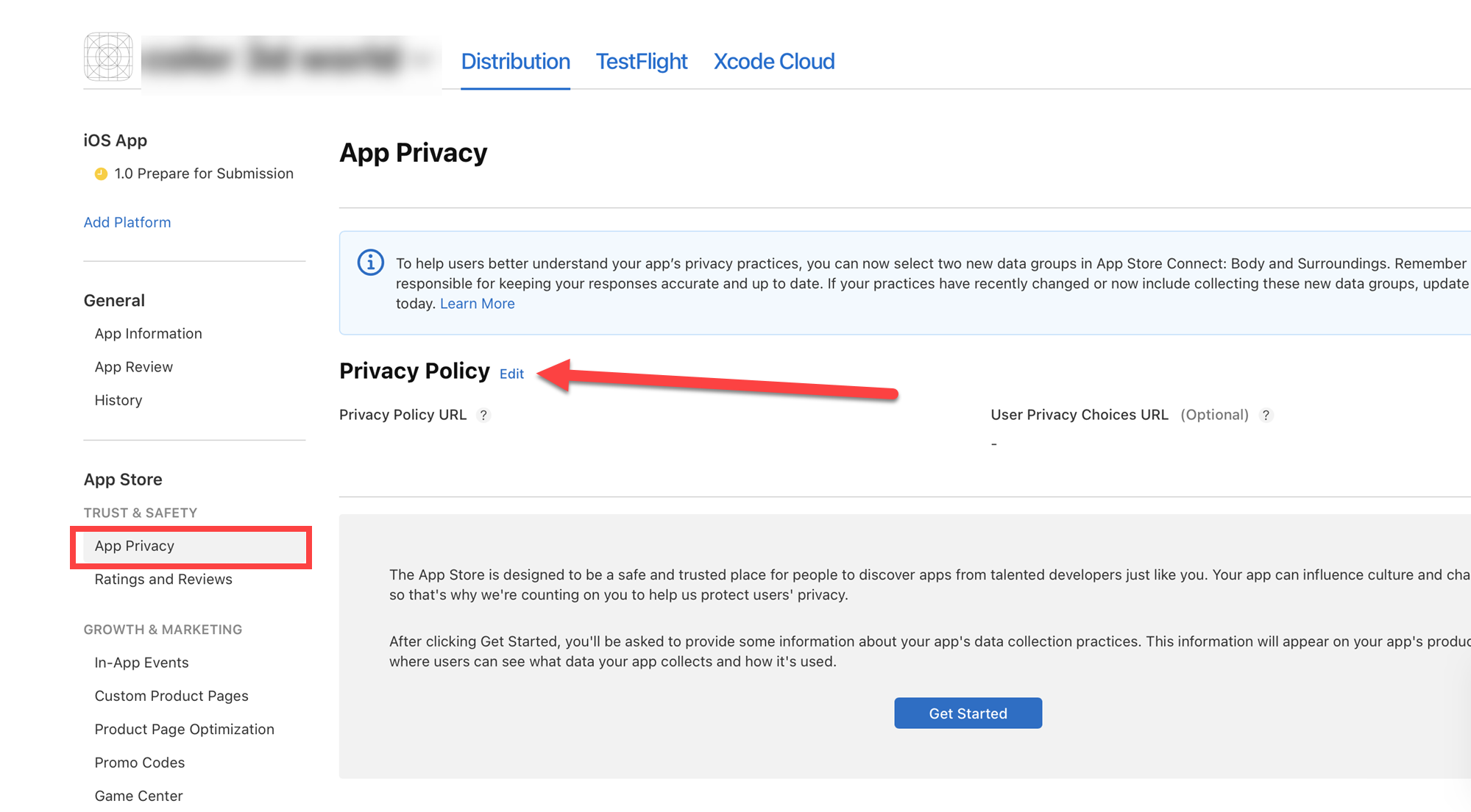 1)좌측의 App Privacy(앱이 수집하는 개인정보)에서 Privacy Policy(개인정보 처리방침)의 edit(편집)으로 이동합니다.