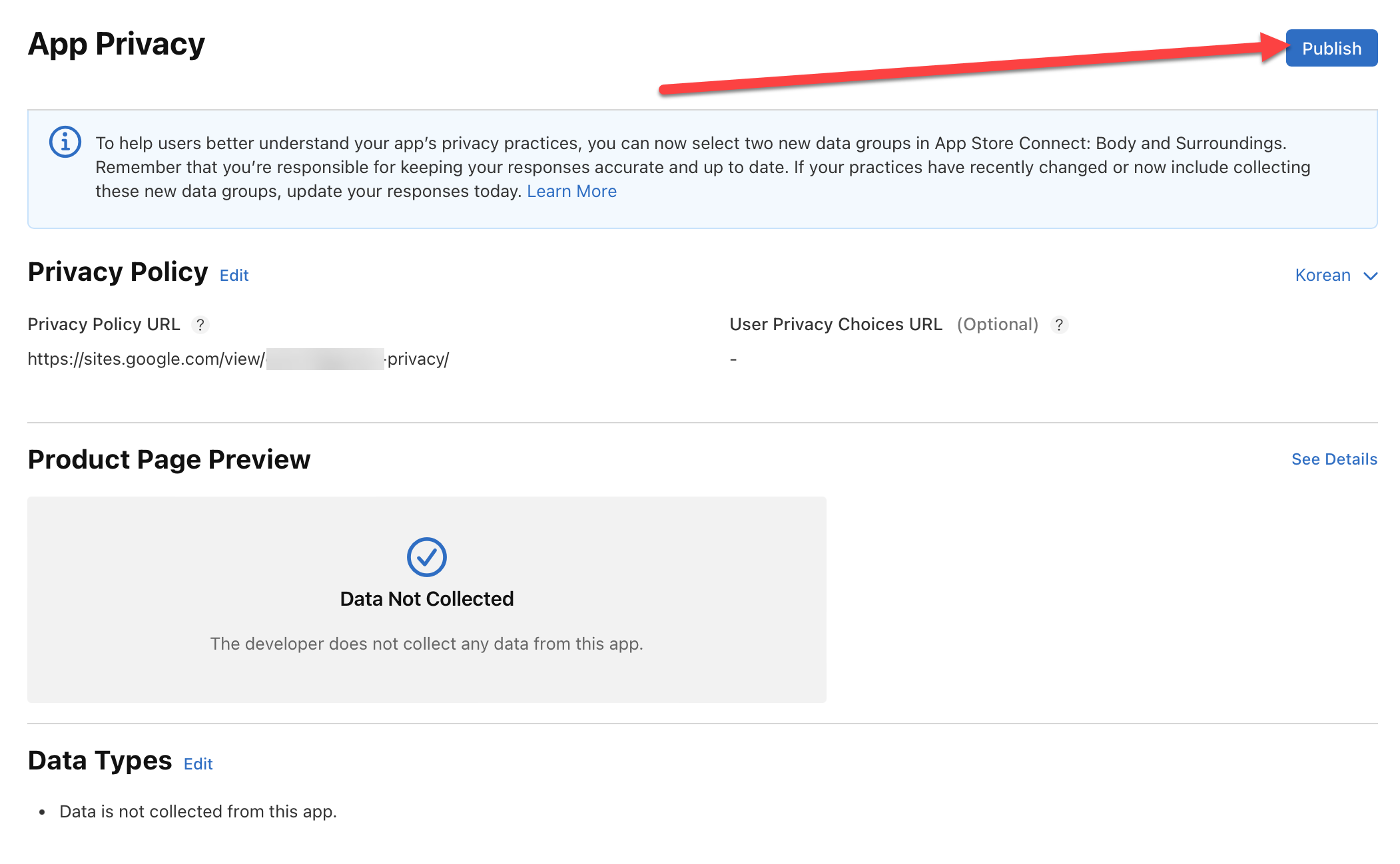 개인정보 처리방침과 데이터 수집 여부 설정을 마치고 게시하려면 publish를 클릭합니다.