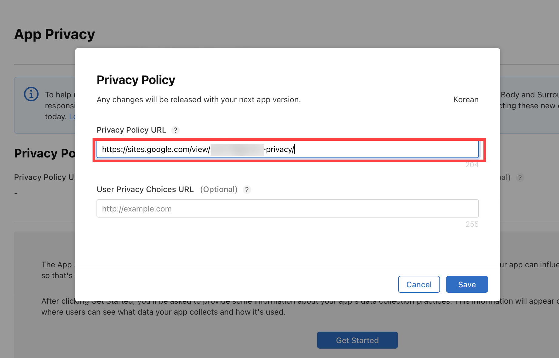 3)개인정보 처리방침 URL이 추가된것을 확인할수있습니다.