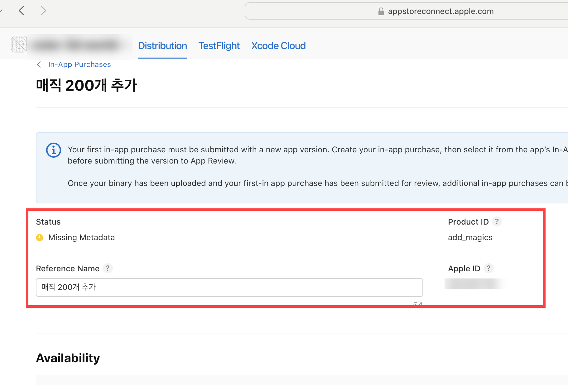4)해당 인앱구매가 사용가능한 국가 및 지역을 설정하기위해 Availability(사용 가능 여부)의 set up availability(사용가능여부 설정)로 이동합니다.