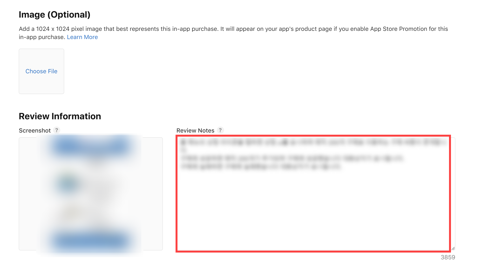 13)review information(심사 정보)에서 인앱구매 심사 목적으로 사용될 스크린샷 이미지를 업로드하고(screenshot) 앱 내 심사에 도움이 될수있는 인앱구매에 대한 추가 정보를 입력합니다(review notes)