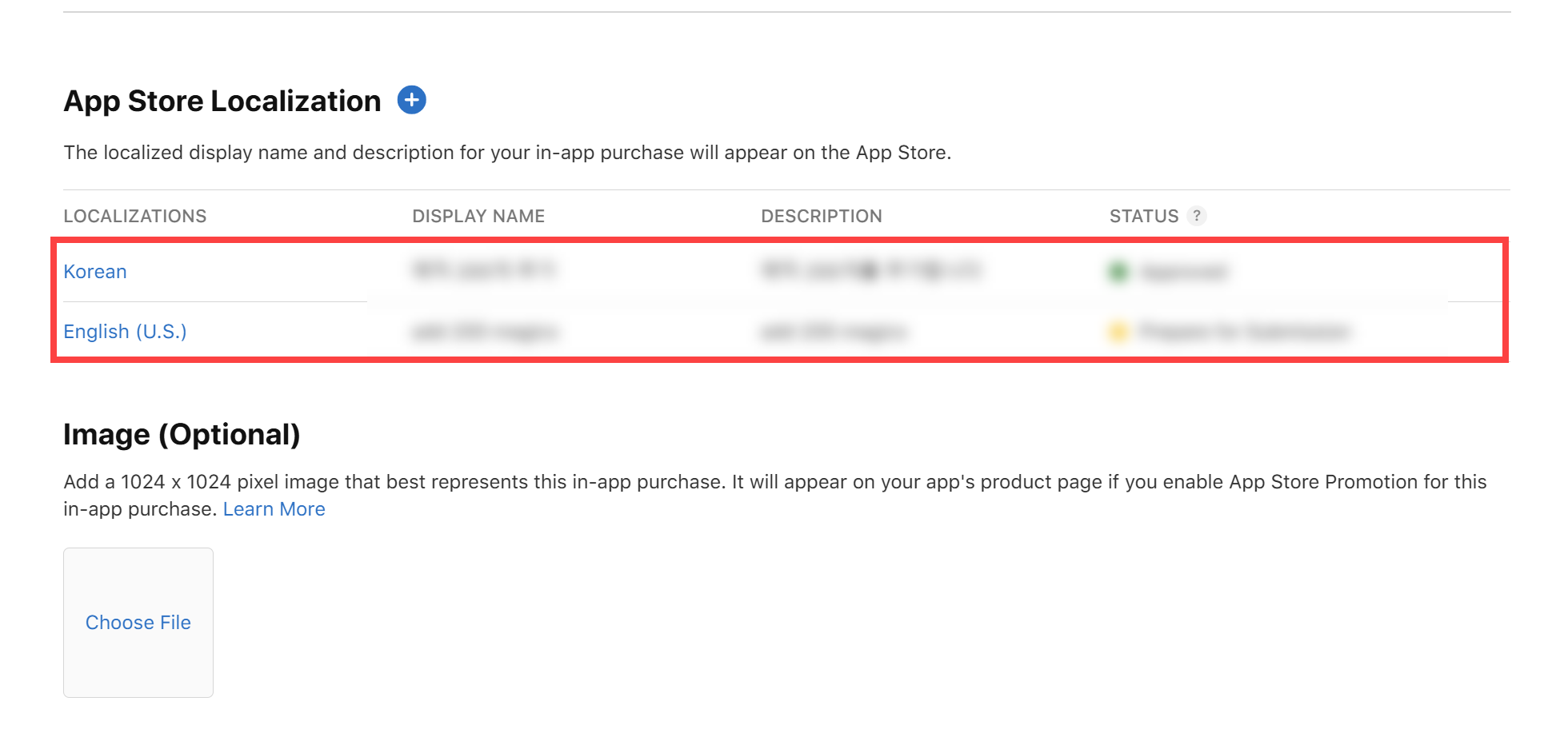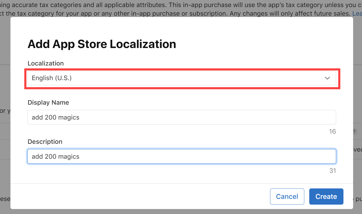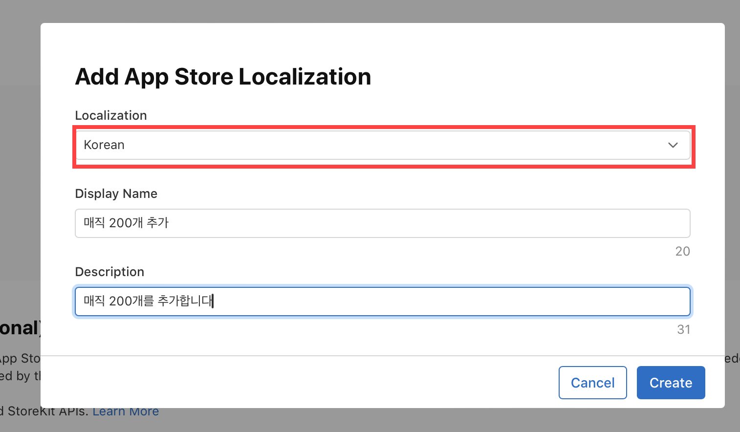 11)앱스토어(App Store)에서 해당 인앱구매를 지역화할 국가(Localization)와 표시할 이름(Display Name) 및 설명(Description)을 입력합니다.