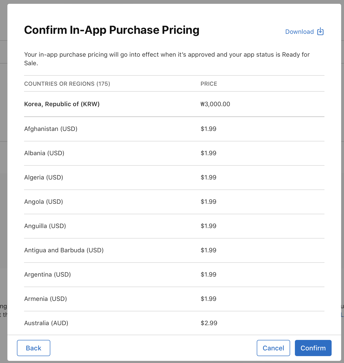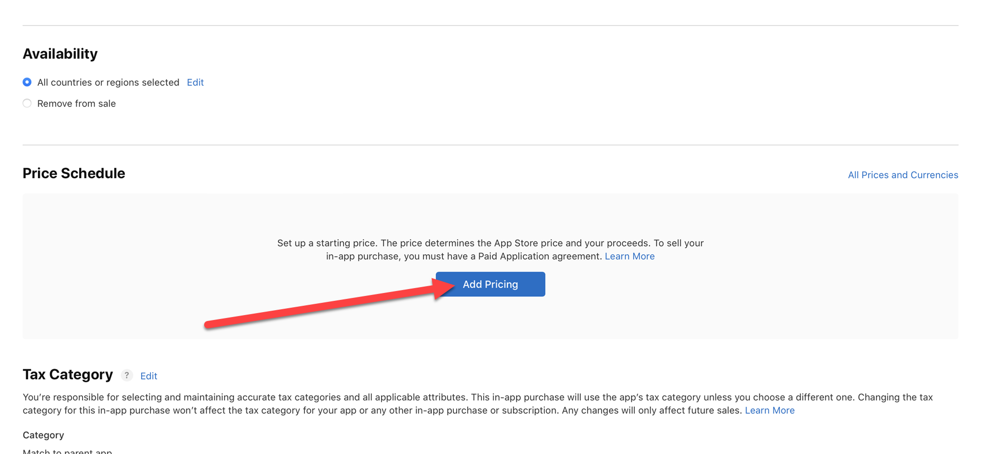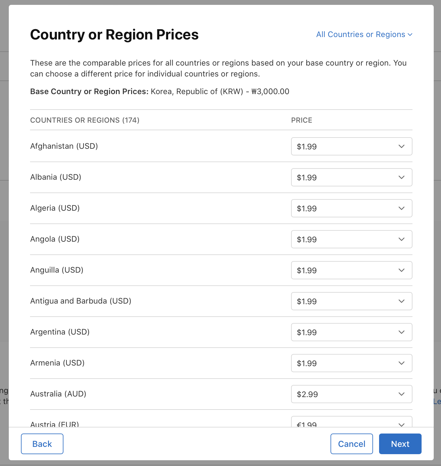 price(가격)을 선택합니다. 기준 국가에 대한 가격을 선택하면 애플에서 세금 또는 환율을 기준으로 다른 모든 국가에 대해 유사한 가격을 제공합니다.