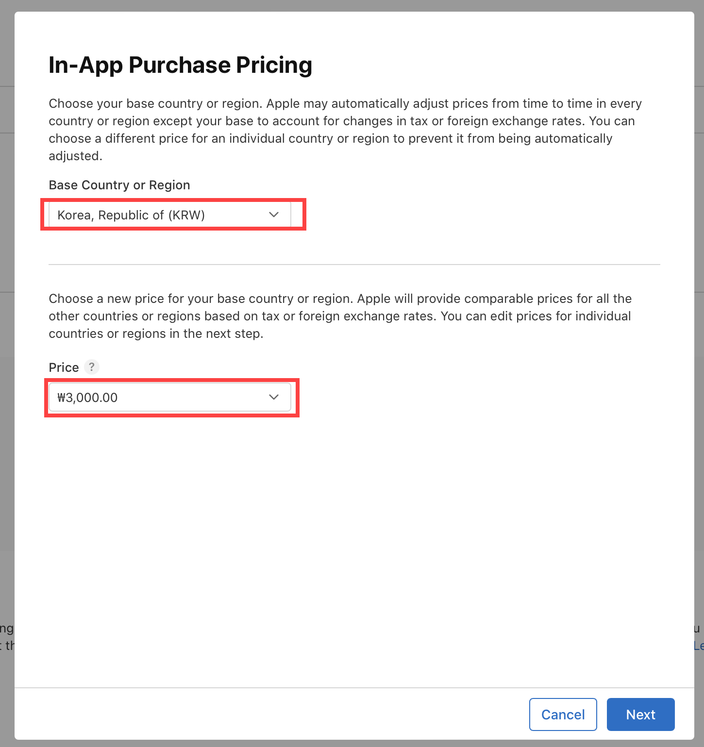 기준 국가를 선택하면 애플에서 선택한 국가를 제외한 모든 국가에 대하여 세금 또는 환율 변화를 고려하여 자동으로 가격을 조정합니다. 대한민국의 경우 Korea, Repulbic of (KRW)을 선택합니다.