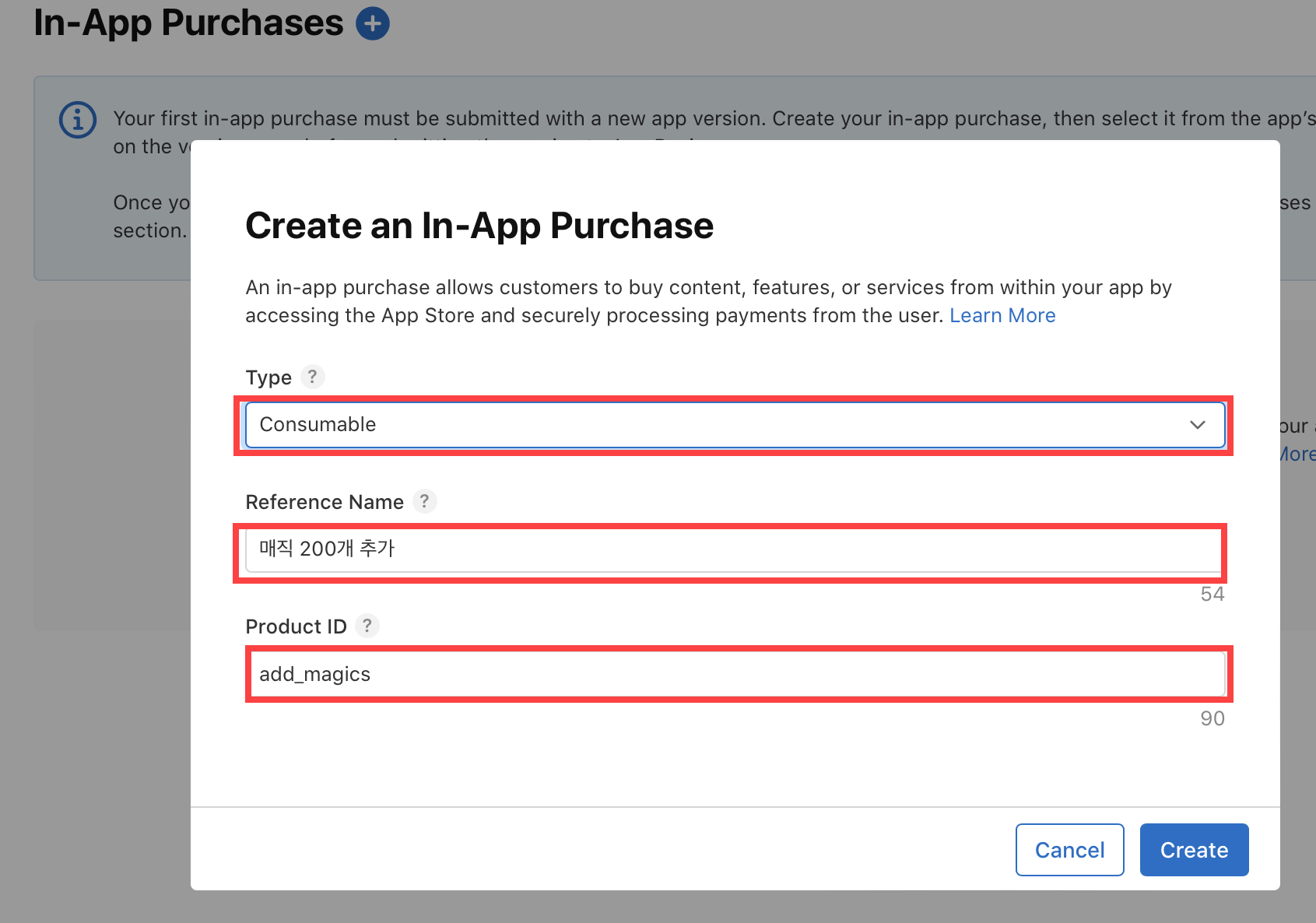 Type(유형) - 소모성 또는 비소모성 유형을 선택합니다.