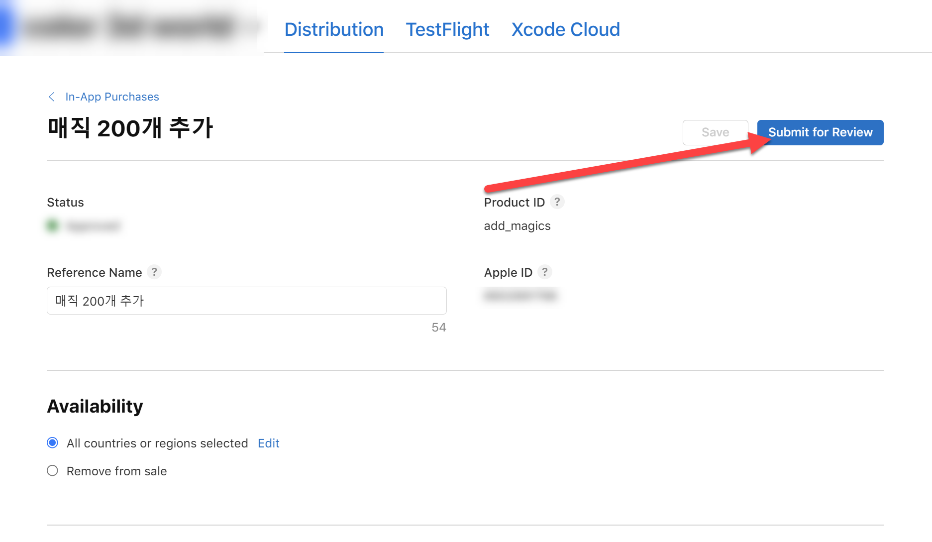 14)인앱 구매 설정을 마치고 우측 상단의 submit for review(심사를 위해 제출)를 클릭합니다.