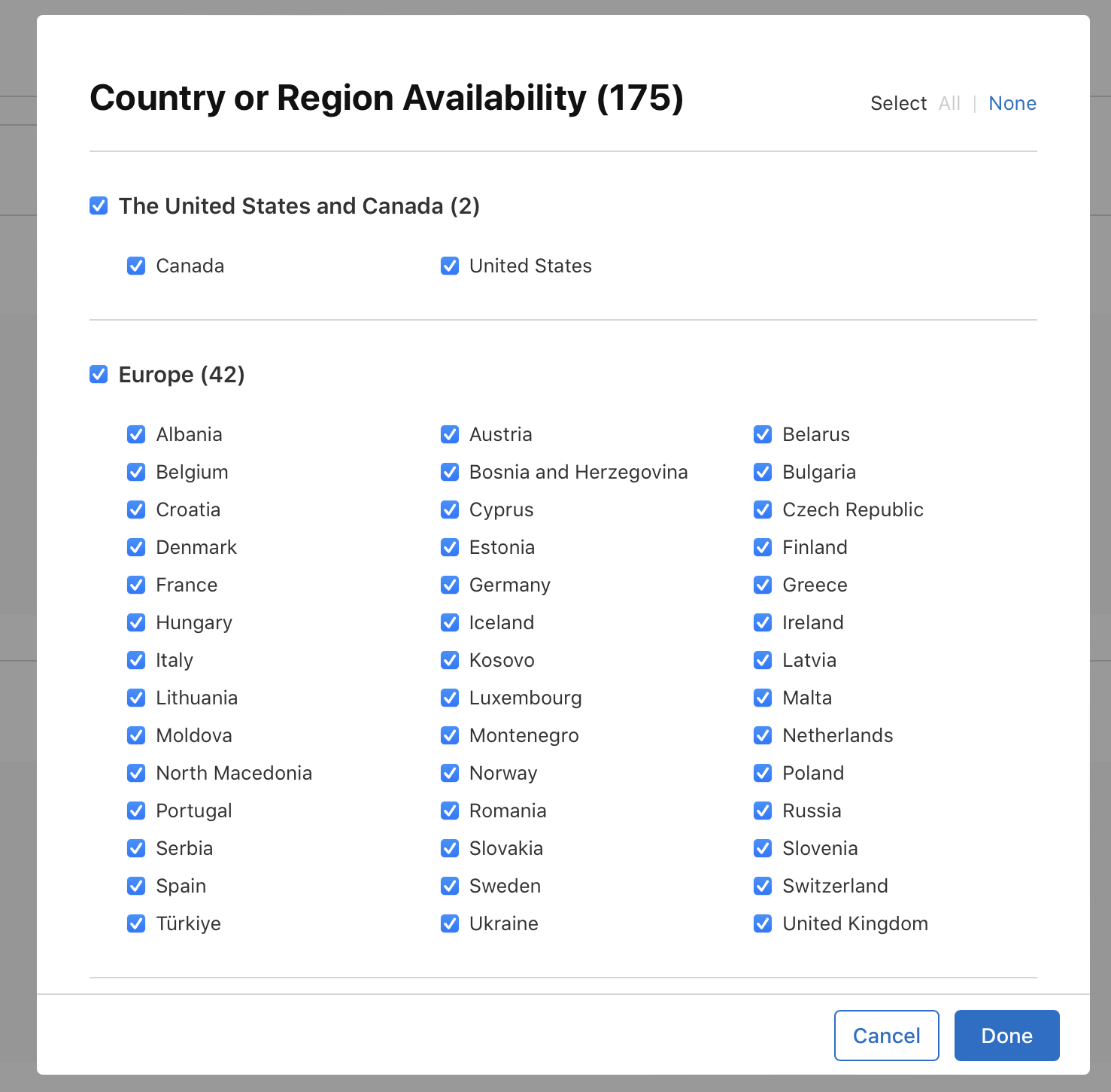 5)Country or Region Availability(국가 및 지역 사용 가능 여부)에서 해당 인앱구매를 이용가능한 모든 국가 및 지역을 선택합니다.