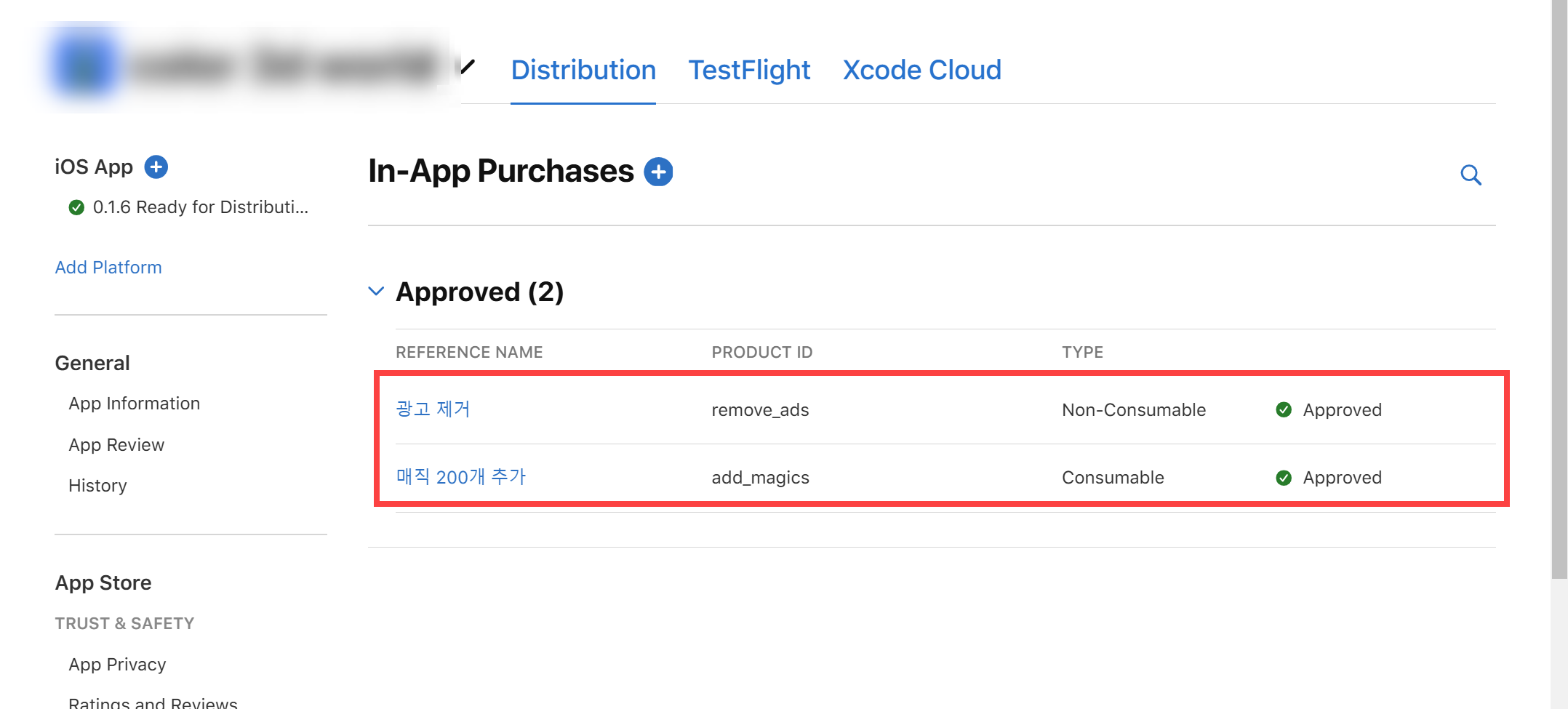 15)같은 방법으로 인앱구매를 추가합니다. 심사가 완료되면 해당 인앱구매에 대하여 승인됨(Approved)을 표시합니다.
