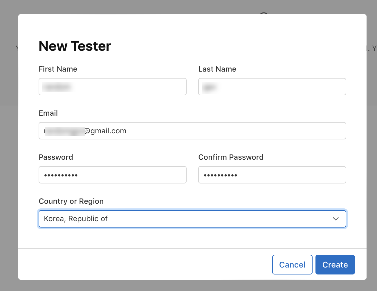 3)샌드박스 테스트 계정으로 추가할 신규 테스터 정보를 입력합니다.